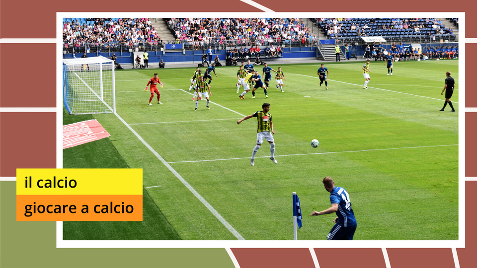 5 | Ilustracja przedstawia piłkarzy rozgrywających mecz na stadionie piłkarskim. | il calcio, giocare a calcio | L'attuale capitano della squadra azzurra è il calciatore Giorgio Chiellini. |