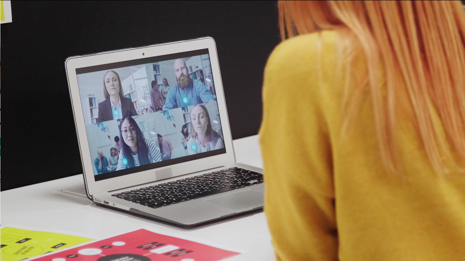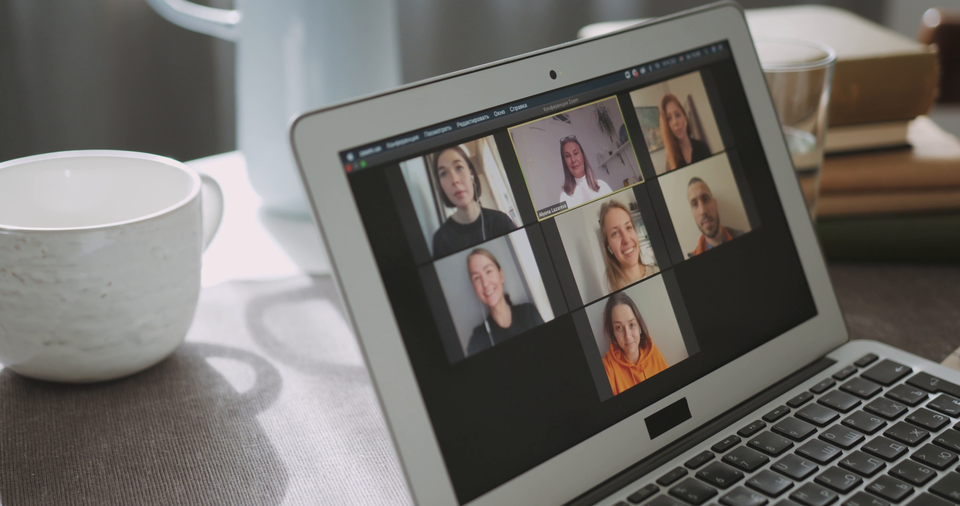 Krótki filmik przedstawia otwarty laptop stojący na biurku. Na monitorze laptopa widoczne jest siedem pól z różnymi osobami, które biorą udział w spotkaniu online. Część z osób ma słuchawki w uszach. Osoby uśmiechają się, machają, mówią, gestykulują. Na biurku za laptopem widoczny jest biały kubek, stos książek, szklanka z wodą.