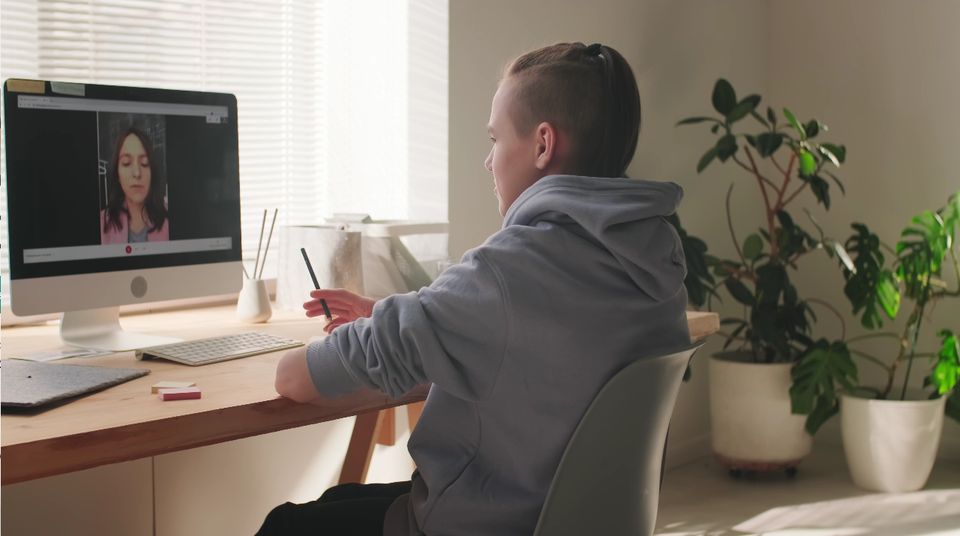 Krótki filmik przedstawia chłopca, w ujęciu z lewego boku, który siedzi przy biurku, przed monitorem komputera. Chłopiec ma ciemne włosy, wygolone na bokach i związane w kucyk na górze głowy. Jest ubrany w szarą bluzę z kapturem. Na biurku widoczne są również: klawiatura komputera, zeszyt, karteczki samoprzylepne, pojemnik z ołówkami, myszka do komputera. Na monitorze widoczna jest twarz kobiety w wieku około 30 lat, na na tle czarnej tablicy szkolnej. Chłopak w prawej ręce trzyma ołówek, którym coś zapisuje i prowadzi rozmowę z kobietą widoczną na ekranie komputera.