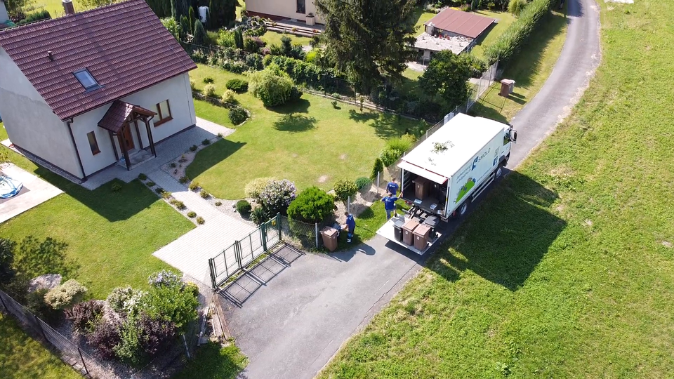 Krótki filmik (bez dźwięku) przedstawia widok z lotu ptaka na biały dom kryty dachówką, otoczony zielonym trawnikiem, oraz samochód ciężarowy zaparkowany na wąskiej drodze biegnącej koło domu. Widoczni są trzej mężczyźni w takich samych, granatowych koszulkach. Dwóch z nich stoi na platformie przyczepy wypełnionej jasnobrązowymi i czarnymi kontenerami na śmieci, a jeden wyrzuca coś do małego czarnego kontenera, który już stoi wraz z jasnobrązowym kontenerem obok podjazdu do budynku. Następnie filmik pokazuje ten sam widok z poziomu gruntu. Mężczyźni przechodzą z przodu samochodu i widoczna jest przyczepa samochodu wypełniona jasnobrązowymi i czarnymi kontenerami na śmieci. Na boku przyczepy widoczny jest rysunek połowy zielonej planety oraz napisy. W oddali widoczny jest kolejny dom, droga prowadząca w dół stoku oraz wzgórza porośnięte drzewami..