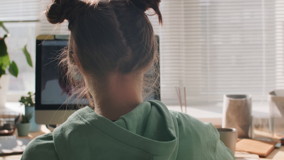 Krótki filmik przedstawia młodą dziewczynę siedzącą tyłem do obiektywu, w ujęciu od ramion w górę. Dziewczyna uczestniczy w lekcji online. Ma długie, ciemne włosy związane w dwa koki, jest ubrana w zieloną bluzę z kapturem i siedzi za biurkiem, na którym stoi duży monitor komputera. Na monitorze komputera widoczna jest młoda kobieta, którą widać na tle szkolnej tablicy. Kobieta coś mówi. Na biurku dziewczyny widoczna jest także klawiatura, doniczki z kwiatkami, kubek, pojemnik na dokumenty.