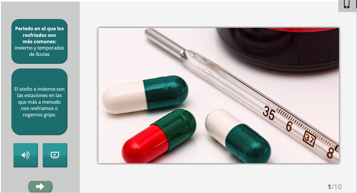 Pierwszy slajd przedstawia termometr i trzy kolorowe tabletki leżące na stole. Opis slajdu: Periodo en el que los resfriados son más comunes: invierno y temporadas de lluvias. El otoño e invierno son las estaciones en las que muy a menudo cogemos frío y gripe.