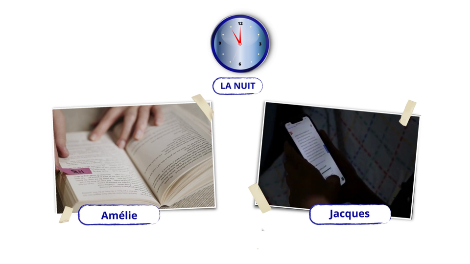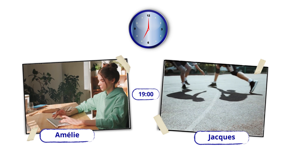 Et ta journée ordinaire, ressemble‑t-elle plutôt à celle d'Amélie ou de Jacques ? Tu te réveilles à quelle heure ? Après, tu te laves ou tu t'habilles ? Comment tu te reposes après l'école ? Tu fais du sport ou tu as des cours extra‑scolaires ? À quelle heure tu t'endors ?