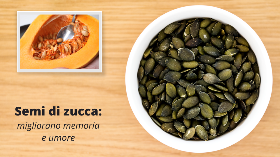 Na slajdzie znajduje się krótki film i zdjęcie. Zdjęcie przedstawia miseczkę pełną wyłuskanych pestek dyni. Na krótkim filmiku osoba, której widoczne są tylko dłonie, wybiera łyżką pestki z rozkrojonej dyni. | Semi di zucca: migliorano memoria e umore | I semi di zucca sono ricchi di zinco, prezioso minerale vitale in grado di migliorare la memoria e le capacità del pensiero. Questi piccoli semi sono anche ricchi di magnesio, minerale antistress e altri elementi responsabili del buon umore. |