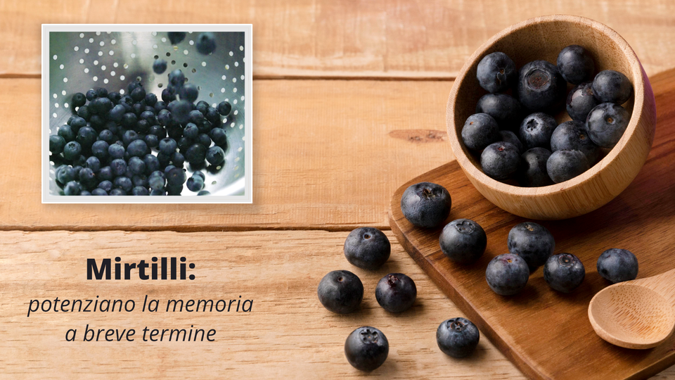 Na slajdzie znajduje się krótki film i zdjęcie. Zdjęcie przedstawia niewielką bambusową miseczkę z borówkami. Borówki są rozsypane również na blacie wokół miseczki. Widoczny jest także fragment drewnianej łyżki, która leży obok. Krótki filmik przedstawia borówki, które są wsypywane do miski typu durszlak. | Mirtilli: potenziano la memoria a breve termine | Le prove scientifiche dimostrano che il consumo di mirtilli può essere efficace nel migliorare o ritardare la perdita di memoria a breve termine, benefici che si possono ottenere anche dal consumo di altra frutta e verdura di colore rosso scuro e viola, come uva nera, ciliegie, fragole, lamponi e more. |