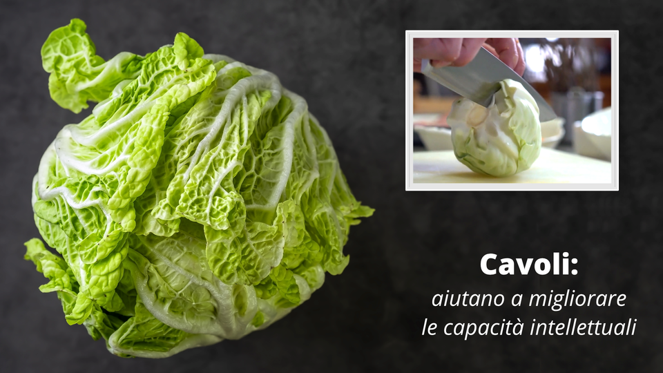 Na slajdzie znajduje się krótki film i zdjęcie. Zdjęcie przedstawia główkę kapusty. Na krótkim filmiku osoba, której widoczne są tylko dłonie kroi kapustę na pół. Czynność ta odbywa się przy pomocy dużego noża, na desce do krojenia. | Cavoli: aiutano a migliorare le capacità intellettuali | I vari tipi di cavoli, cavolfiore, broccolo, cavoletti di Bruxelles sono una grande fonte di vitamina K, nota per la sua capacità di migliorare la funzione cognitiva. Da vari studi emerge che aiutano il corretto funzionamento del sistema nervoso centrale e per mantenere cervello sano. |