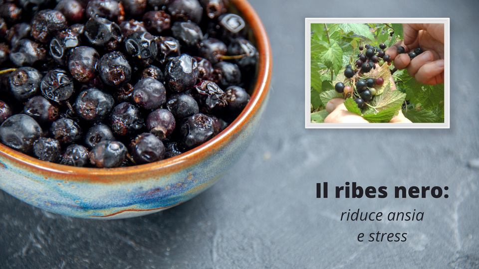 Na slajdzie znajduje się krótki film i zdjęcie. Zdjęcie przedstawia porcelaną miseczkę pełną ciemnych porzeczek. Na filmiku osoba, której widoczne są tylko dłonie zrywa z krzaka porzeczki. | Il ribes nero: riduce ansia e stress | La vitamina C è stata a lungo valutata per il suo effetto positivo sulla mente. Diversi studi dimostrano che la vitamina C può essere utile nella gestione dell'ansia e dello stress. Una delle migliori fonti di questa vitamina vitale è il ribes nero ma la si può trovare in abbondanti quantità anche in peperoni, agrumi e broccoli. |