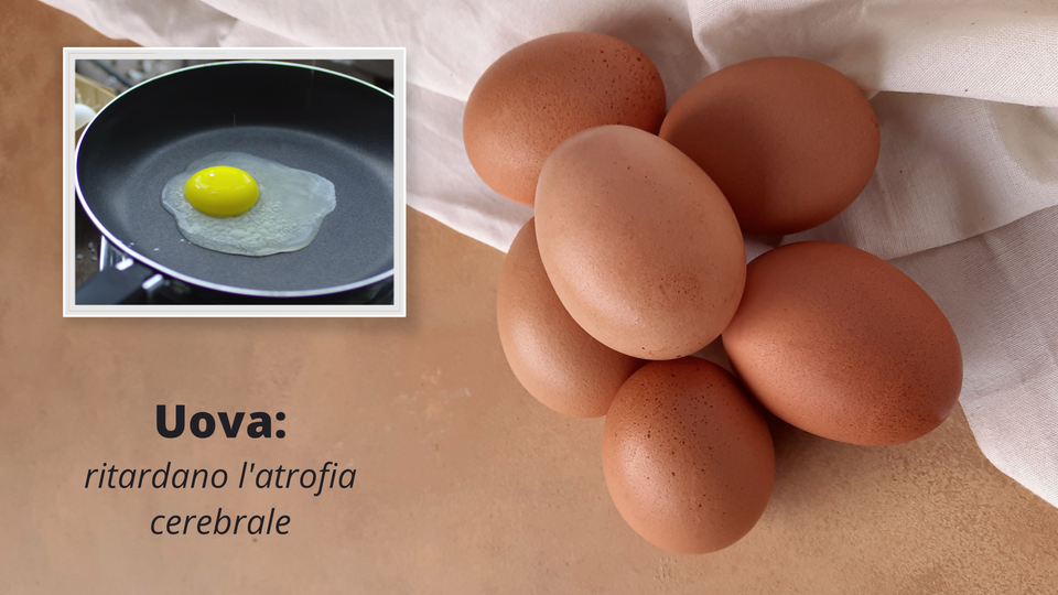 Na slajdzie znajduje się krótki film i zdjęcie. Zdjęcie przedstawia sześć jaj leżących na blacie, na kuchennej ściereczce. Na krótkim filmiku osoba, której widoczne są tylko dłonie wybija jajko na patelnie. | Uova: ritardano l’atrofia cerebrale | Alimenti ricchi del complesso della vitamina B (B6, B12 e acido folico) come uova, pollo, pesce e verdure a foglia verde aiutano la salute, prevenendo l’atrofia cerebrale. |