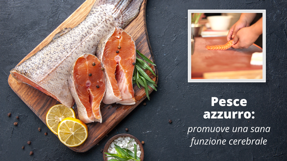 Na slajdzie znajduje się krótki film i zdjęcie. Zdjęcie przedstawia połowę surowego łososia i dwa dzwonka. Ryba leży na grubej drewnianej desce, na blacie. Obok ryby znajdują się dwa plastry cytryny. Na blacie widoczna jest także miseczka z gruboziarnistą solą. Krótki filmik w prawym górnym rogu przedstawia osobę (widoczne są tylko jej dłonie), która kładzie na blacie kuchennym kawałek surowego łososia. | Pesce azzurro: promuove una sana funzione cerebrale | I grassi omega‑3 sono importanti per una sana funzione cerebrale, del cuore, delle articolazioni e per il nostro benessere generale. Le principali fonti di tali grassi sono: salmone, trota, sgombro, aringa e sardine. |