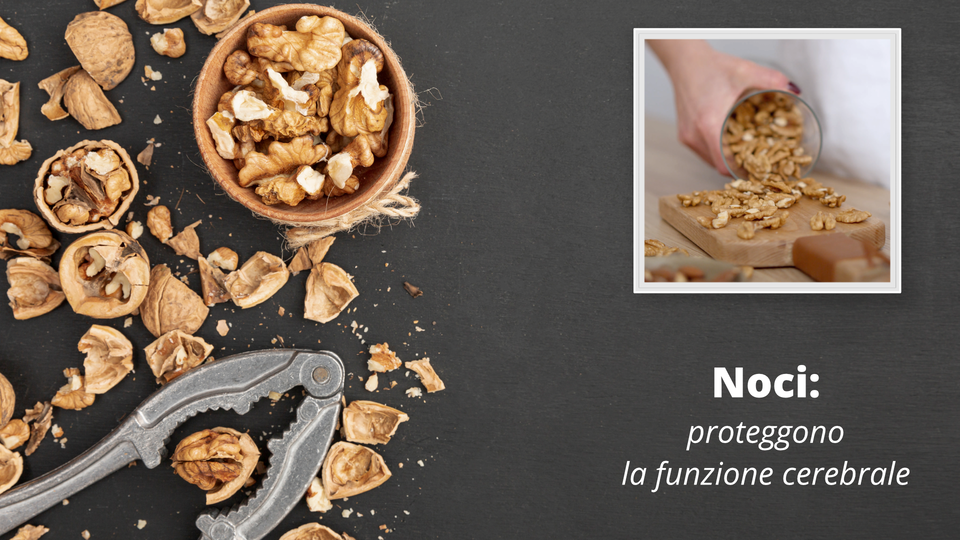 Na slajdzie znajduje się krótki film i zdjęcie. Zdjęcie przedstawia miseczkę z obranymi orzechami włoskimi. Dookoła miseczki, na blacie znajduje się „dziadek do orzechów”, kilka obranych orzechów oraz rozsypane niedbale skorupki. Na krótkim filmiku kobieta, której widoczna jest tylko ręka, wysypuje obrane orzechy włoskie na deskę do krojenia. Deska znajduje się na blacie. | Noci: proteggono la funzione cerebrale | Diversi studi suggeriscono che un buon livello di vitamina E aiuta a mantenere il buon funzionamento del cervello. Per questo conviene mangiare le noci che ne sono una grande fonte, come anche mandorle, anacardi, noci pecan, noci brasiliane, nocciole, semi di sesamo, lino, girasole, che tra l’altro contengono anche gli acidi omega‑3. |