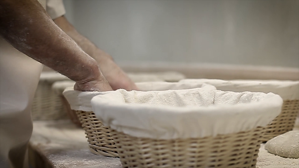 Na zdjęciu po lewej stronie widzimy korpus ubranego na biało mężczyzny i jego oprószone mąką ręce. Dłonie znajdują się w wiklinowym koszyku wyściełanym białym materiałem. Obok kilka innych, takich samych koszyków.