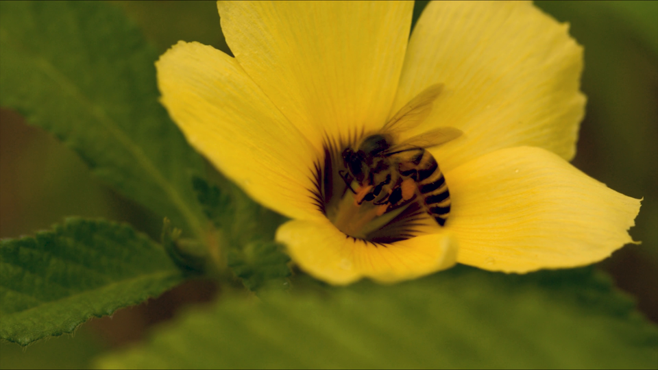Krótki filmik przedstawia kielich kwiatu o żółtych płatkach, w środku którego widoczna jest pszczoła zapylająca kwiatek i trącająca pomarańczowe pręciki. Wokół widoczne są zielone listki kwiatka.