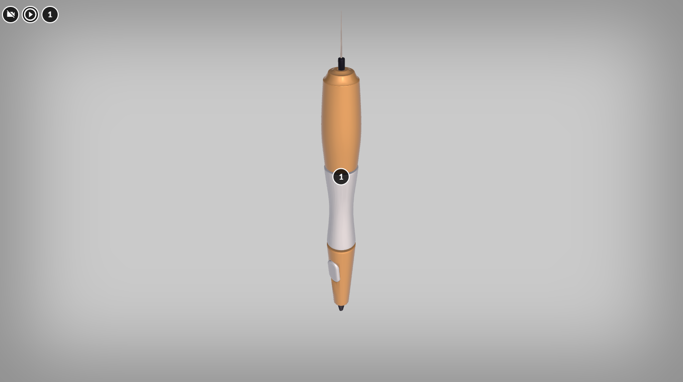 Wizualizacja zatytułowana jest Urządzenie do elektrokoagulacji. W centrum znajduje się urządzenie do elektrokoagulacji, które swoim kształtem przypomina długopis. Na jednym końcu znajduje się długa cienka igła. Po środku zwężenie ułatwiające trzymanie urządzenia. Po drugiej stronie biały przycisk i na końcu wąska, czarna końcówka. Na ilustracji znajduje się punkt interaktywny, po kliknięciu którego pojawia się ramka z tekstem.