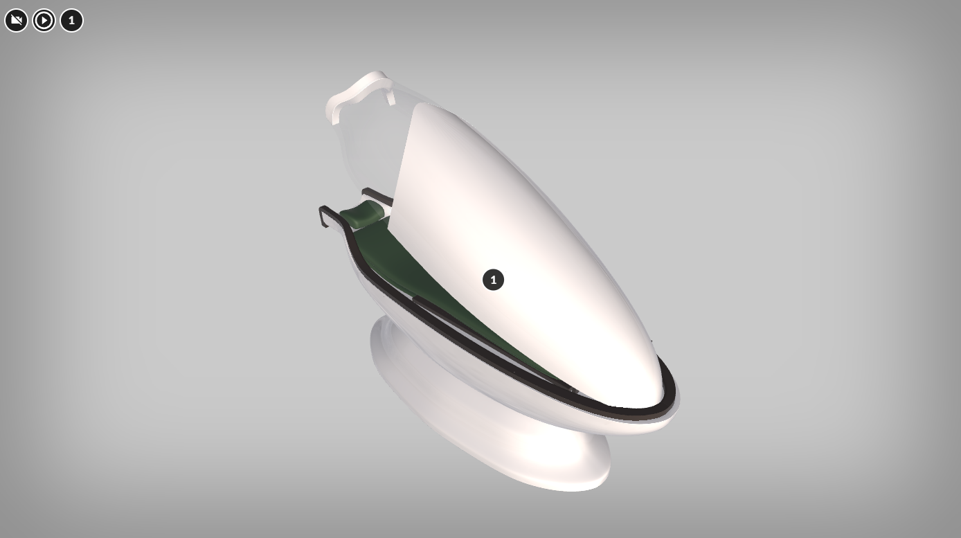 Wizualizacja przedstawia kapsułę SPA, która ma kształt wanny częściowo zamkniętej od góry. Służy ona do wykonywania różnego rodzaju kąpieli, aromaterapii oraz zabiegów na ciało po uprzednim nałożeniu maski na ciało. Wskazania do zabiegu to: stres, odnowa biologiczna po intensywnym wysiłku, modelowanie sylwetki, działanie antycellulitowe, wyszczuplające, ujędrniające, redukujące rozstępy, poprawiające drenaż płynów w tkankach. Zabieg ma działanie wielokierunkowe – oprócz wpływu ciśnienia hydrostatycznego lub hydrodynamicznego wody, na skórę oddziałują składniki aktywne olejków eterycznych, soli lub zastosowanych kosmetyków oraz światło LED lub muzykoterapii, które mogą stanowić dodatkowe wyposażenie kapsuły.