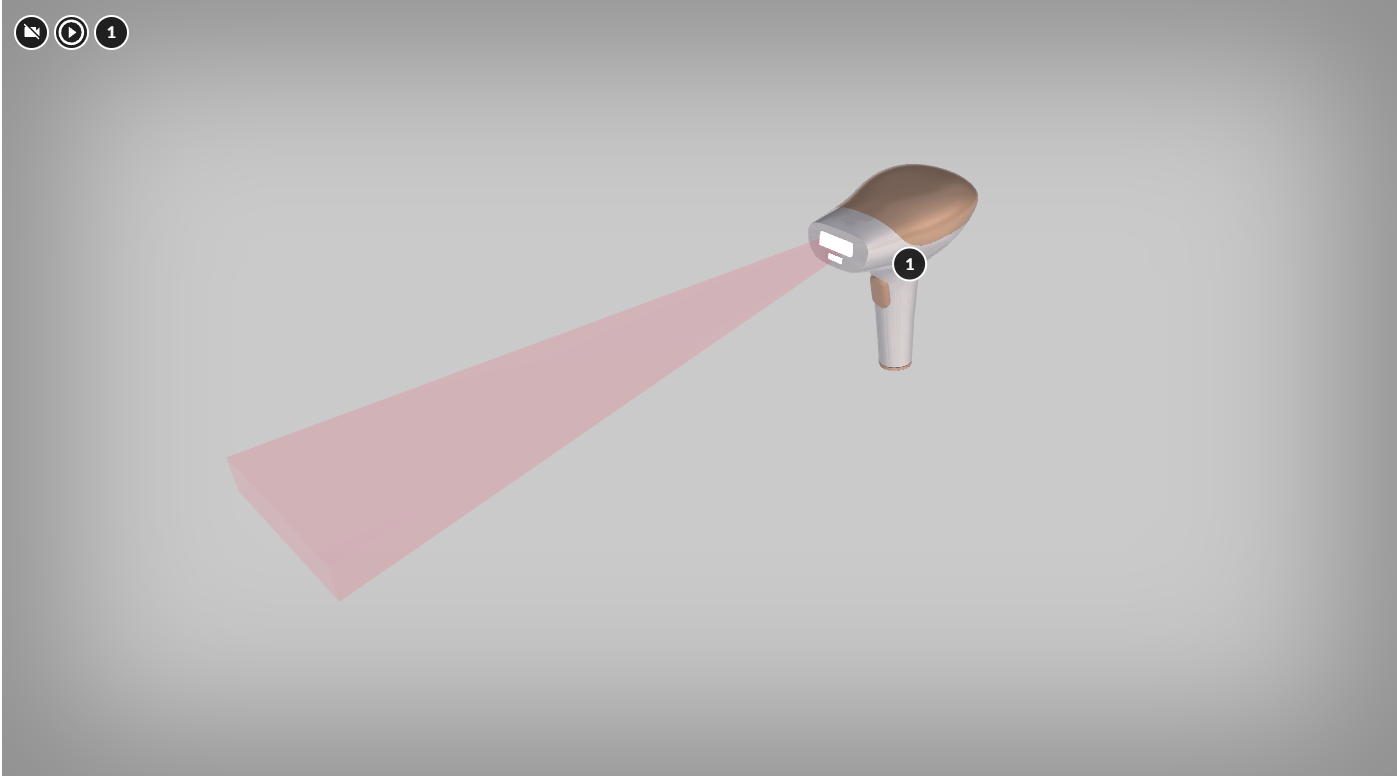 Wizualizacja zatytułowana jest IPL W centrum znajduje się laser złożony z rękojeści i korpusu. Na rękojeści jest przycisk. Urządzenie zakończone jest prostokątnym źródłem światła, z którego wychodzi czerwona, szeroka wiązka światła. Na ilustracji znajduje się punkt interaktywny, po kliknięciu którego pojawia się ramka z tekstem.