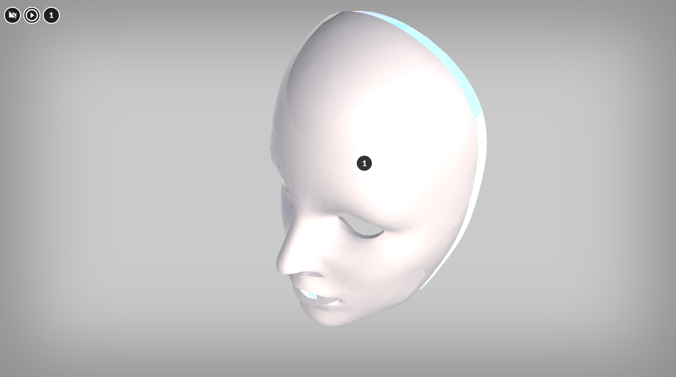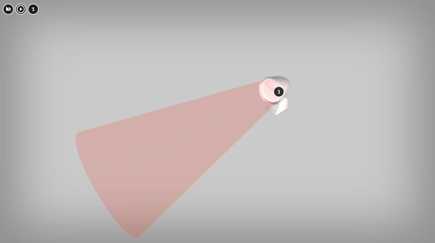 Wizualizacja zatytułowana jest Lampa LED W centrum znajduje się biała maska, która po wewnętrznej stronie świeci niebieskim światłem. Na ilustracji znajduje się punkt interaktywny, po kliknięciu którego pojawia się ramka z tekstem.