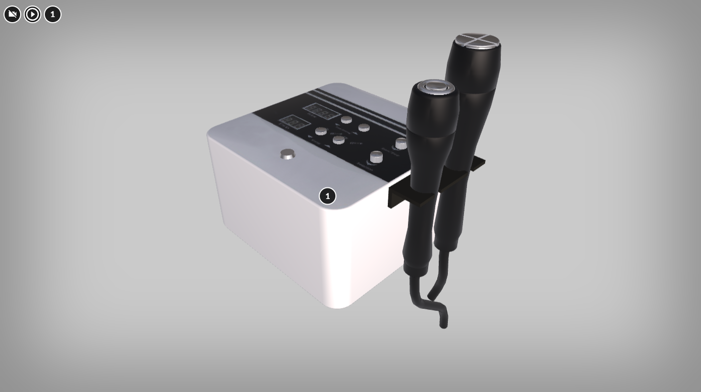 Wizualizacja zatytułowana jest Urządzenie do RF (do radiofrekwencji multipolarnej). W centrum znajduje się urządzenie do radiofrekwencji multipolarnej. Składa się z panelu sterującego, na którym znajdują się dwa wyświetlacze,cztery przyciski i dwa pokrętła. Z boku urządzenia powieszone są dwie głowice złożone z rękojeści i okrągłych końcówek. Jedna końcówka podzielona jest na cztery części a druga składa się z koła i okręgu. Na ilustracji znajduje się punkt interaktywny, po kliknięciu którego pojawia się ramka z tekstem.