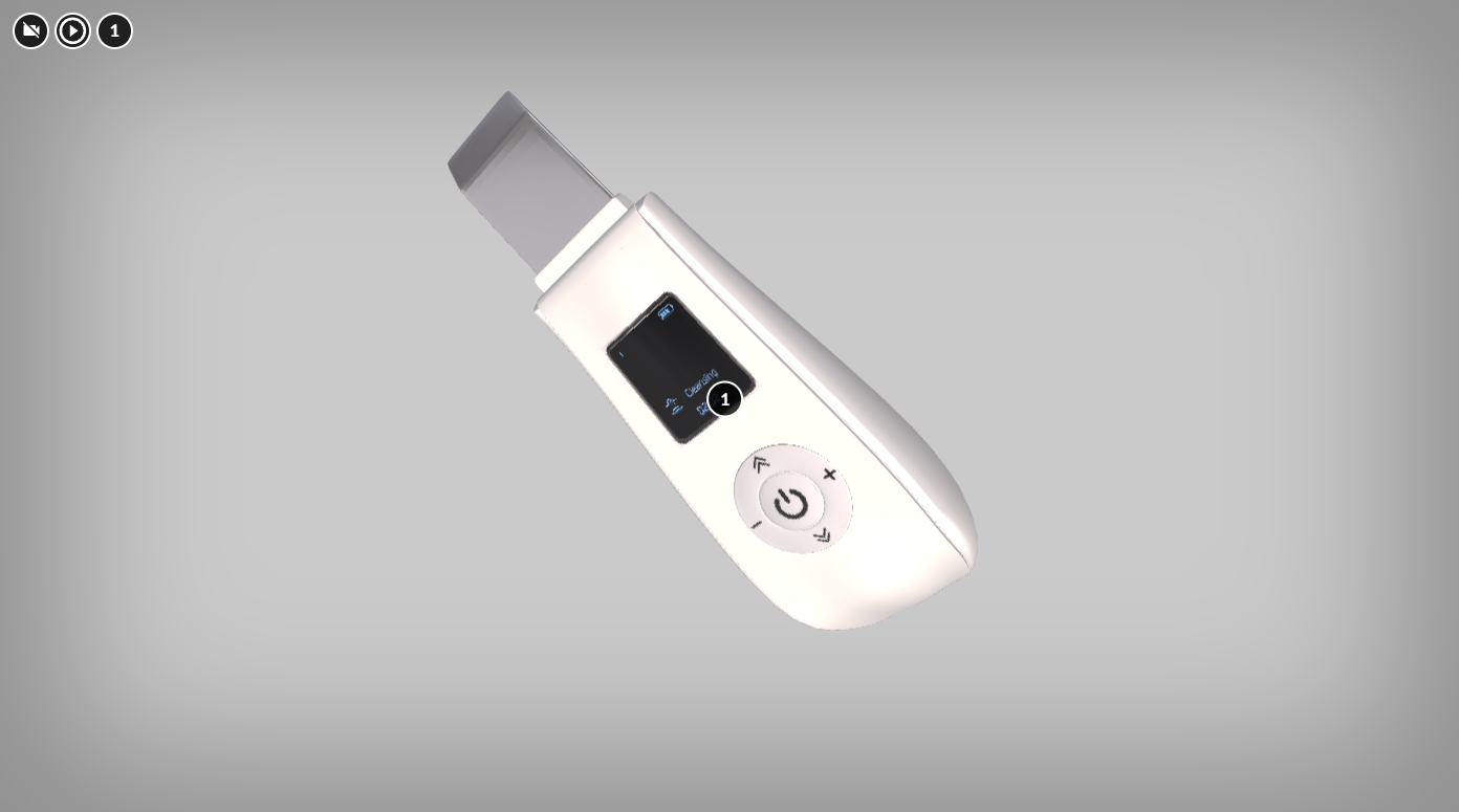 Wizualizacja zatytułowana jest Urządzenie do kawitacji W centrum znajduje się przyrząd do kawitacji. Składa się z rączki, na której jest ekran oraz przycisk włączenia, wyłączenia i przyciski sterujące. Na końcu rączki jest metalowa końcówka w formie szpatułki. Na ilustracji znajduje się punkt interaktywny, po kliknięciu którego pojawia się ramka z tekstem.