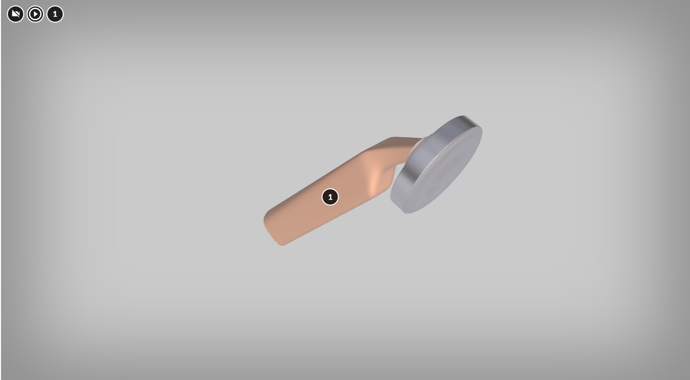 Wizualizacja zatytułowana jest Urządzenie do elektrostymulacji. W centrum znajdują się 4 elektrody do elektrostymulacji. Połowa każdej z elektrod zaklejona jest beżowym plastrem o regularnym kształcie kwadratu z zaokrąglonymi rogami - kształt ich końcówek przypomina literę Y. Na zewnątrz wystają srebrne, podłużne końcówki z wejściem na kabelek. Na ilustracji znajduje się punkt interaktywny, po kliknięciu którego pojawia się ramka z tekstem.