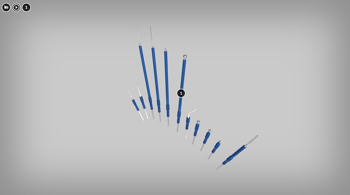 Wizualizacja zatytułowana jest Przykładowe kształty elektrod. W centrum znajduje się jedenaście elektrod o różnym kształcie i rozmiarze (od lewej: dwie małe, cztery ponad dwa razy większe z różnymi końcówkami - ostrymi i okrągłymi, 4 małe w tym jedna z wygiętą końcówką oraz 1 średniej wielkości). Elektrody są w kolorze niebieskim (uchwyt), zakończenia są srebrne i białe. Na ilustracji znajduje się punkt interaktywny, po kliknięciu którego pojawia się ramka z tekstem.