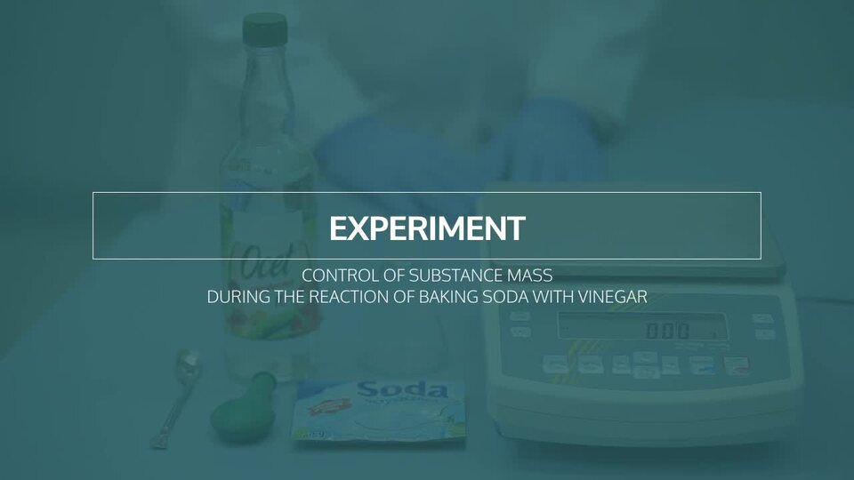 Nagranie filmowe przedstawiające eksperyment- kontrola masy substancji podczas reakcji sody oczyszczonej z octem. Do przeprowadzenia eksperymentu potrzebne są: waga laboratoryjna, proszek do pieczenia, ocet winny, mała kolba pomiarowa, balon, łyżeczka. Przebieg doświadczenia: dodaj 2–3 łyżeczki sody oczyszczonej do balonu, następnie do kolby miarowej wlej 20–30 cm3 octu, później umieść balon na szyjce kolby, upewnij się, że soda nie dostanie się do kolby, następnie umieść zestaw na wadze laboratoryjnej, gdy masa kolby zostanie ustawiona na wadze, podnieś balon i dodaj sodę do octu. Ponownie sprawdź wskazanie wagi.