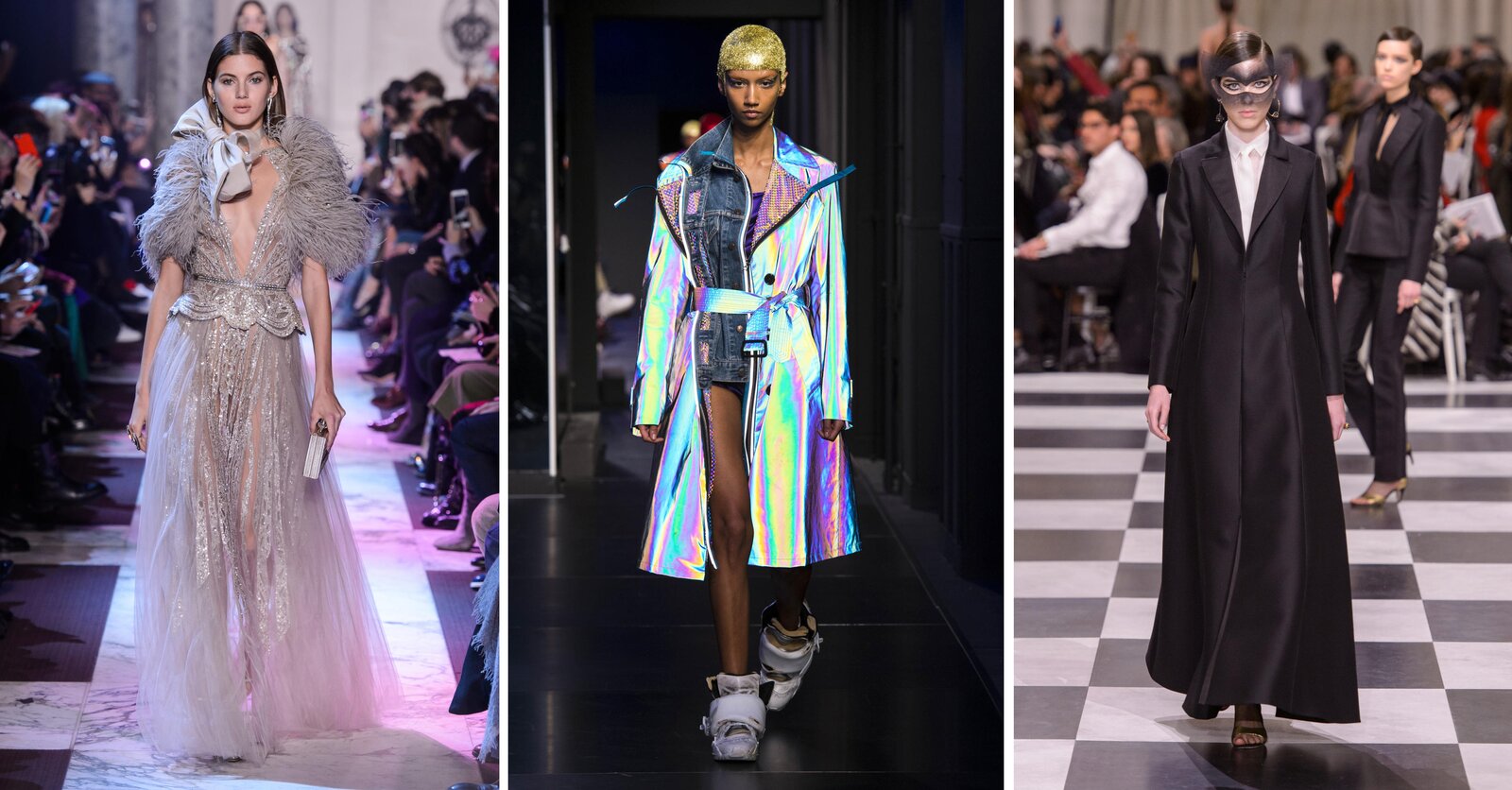 Ilustracja przedstawia trzy kobiety stojące na różnych wybiegach. Pierwsza kobieta od lewej strony ubrana jest w długą błyszczącą suknię, na której znajdują się elementy piór. Kolejna z kobiet ubrana jest w holograficzny płaszcz założony na dżinsową kurtkę oraz białe buty. Kolejna z kobiet ubrana jest długi czarny płaszcz sięgający do kostek, białą koszulę oraz na twarzy ma założoną maskę. W tle za kobietami znajdują się ludzie. Ilustracja posiada trzy punkty interaktywne. Po kliknięciu jednego z punktów podświetlają się poszczególne części ilustracji. 1. Zestawienie czerni i bieli oraz prostota kroju klasycznego, długiego płaszcza zaproponowane przez Diora. Podświetla się trzecia kobieta. 2. Holograficzny materiał PCV w awangardowej odzieży sportowej - błyszczący płaszcz, mieniący się barwami, masywne, ale lekkie obuwie. Podświetla się druga kobieta. 3. Bogata suknia łącząca stylu glamour (delikatne jedwabie) z przepychem lat 20 zdobione (elementy z piór). Podświetla się pierwsza kobieta.