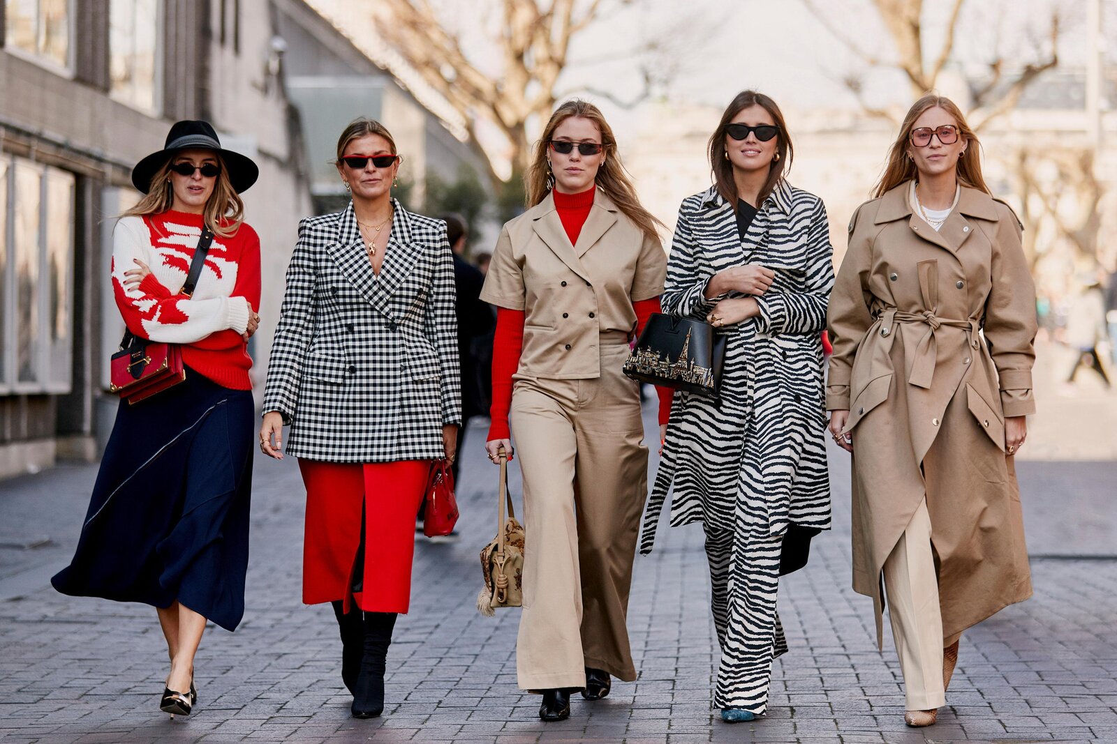 Ilustracja przedstawia pięć kobiet idących w rzędzie w stronę fotografa. Każda z nich ubrana jest w inny strój. Pierwsza kobieta od lewej strony ubrana jest w czerwonobiały sweter, długą niebieską spódnice oraz czarne buty. Kobieta ma czerwoną torebkę przepasaną przez ramię oraz czarny kapelusz. Kolejna z kobiet ubrana jest w marynarkę w czarno białą kratkę, długą czerwoną spódnicę, z rozcięciem po środku oraz czarne kozaki. Kolejna kobieta ubrana jest w beżową marynarkę, czerwony sweter, beżowe spodnie oraz czarne buty. Kolejna z kobiet ma na sobie długi płaszcz oraz spodnie z wzorem zebry. Kolejna z kobiet ma na sobie długi beżowy płaszcz oraz spodnie. Każda z kobiet ma na sobie okulary przeciwsłoneczne. W tle ilustracji znajduje się chodnik, drzewa oraz budynki. Przedstawione na ilustracji stylizacje są w stylu High Street Fashion. Ilustracja posiada pięć punktów interaktywnych. Po kliknięciu jednego z punktów podświetla się poszczególne części iustracji. 1. Dobranie kolorystycznych zestawień: czerń - czerwień. Podświetla się pierwsza kobieta. 2. Utrzymanie jednej tonacji (beże). Podświetla się piąta kobieta. 3. Dynamiczne wzory materiału: krata, nieregularne pasy, zebra. Podświetlają się druga oraz czwarta kobiety. 4. Kolorystycznie dobrane dodatki - kapelusz, torebka, buty. Podświetlają się dodatki wszystkich pięciu kobiet. 5. Luźny krój, zapewniający swobodne poruszania. Podświetlają się wszystkie pięć kobiet.
