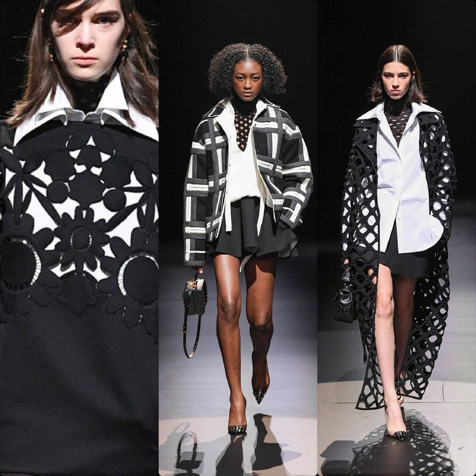 Ilustracja przedstawia trzy kobiety idące po wybiegu. Każda z nich ubrana jest w inny strój, choć wspólnym elementem ich ubioru jest czarny golf znajdujący się pod koszulą. Pierwsza z kobiet ubrana jest w czarno białą suknię z wystającym białym kołnierzem. Druga kobieta ubrana jest w białą koszulę, czarną krótką spódnicę, wysokie spiczaste szpilki oraz kurtkę w geometryczne kształty złożone z czarnych i białych pasków. Kobieta ma czarną torebkę. Ostatnia z kobiet ubrana jest białą koszulę, spódnicę oraz długą czarną narzutę z dziurami. Przedstawione na ilustracji stylizacje są w stylu Ready‑to‑wear. Ilustracja posiada siedem punktów interaktywnych. Po kliknięciu jednego z punktów podświetlają się poszczególne części ilustracji. 1. Kolekcja Valentino „Jesień 2021” jest zmysłowa i romantyczna, wykonana głównie w odcieniach czerni i bieli. Podświetlają się druga oraz trzecia kobieta. 2. Kolorystyka dopełniona przez proste linie i geometryczne kształty - wyłożone kołnierzyki białych koszul o spiczastym, wydłużonym kształcie. Podświetla się pierwsza kobieta. 3. Pod koszulami czarne golfy. Podświetlają się czarne golfy wszystkich trzech kobiet. 4. Kolorystycznie dobrane dodatki - torebka i buty. Podświetlają się torebki i buty drugiej i trzeciej kobiety. 5. Luźne krótkie kurtki i narzuty, niektóre wykończone ażurowym wzorem. Podświetla się kurtka drugiej kobiety, oraz narzuta trzeciej. 6. Spódnice krótkie, proste lub rozkloszowane. Podświetlają się spódnice drugiej i trzeciej kobiety. 7. Spiczaste buty. Podświetlają się buty drugiej i trzeciej kobiety.
