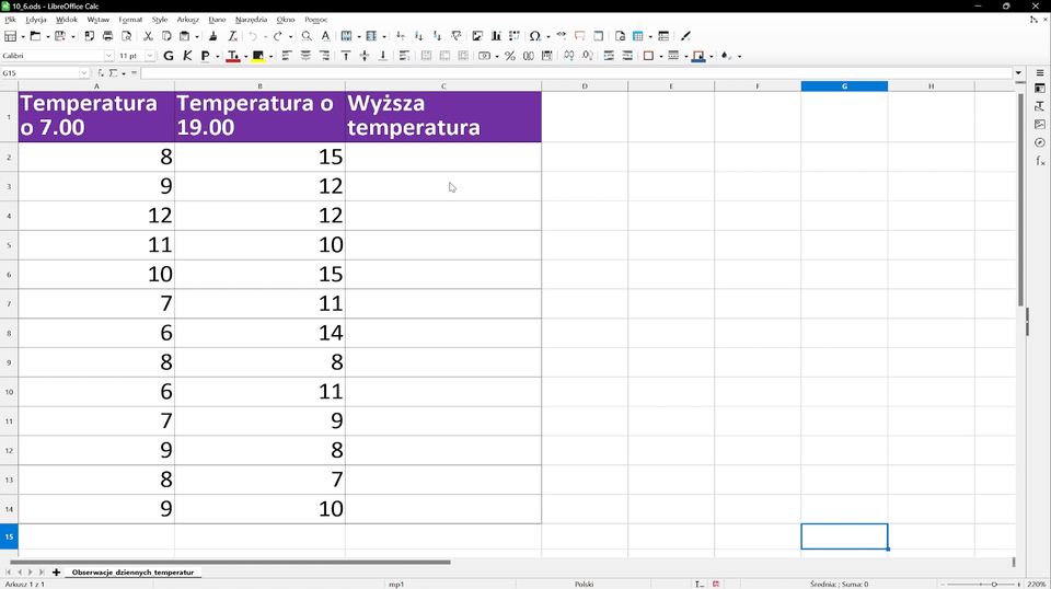 Do wykonania zadania możesz pobrać gotowy plik z tabelą wypełnioną przykładowymi danymi. Aby zaprojektować arkusz, w którym zostaną porównane temperatury, zgodnie z przestawionymi założeniami, postępuj zgodnie z poniższą instrukcją.