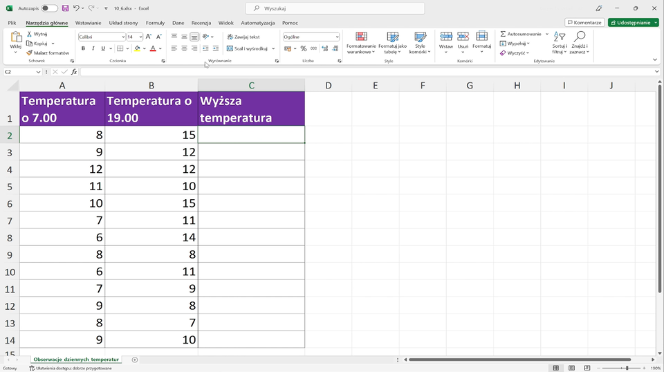Zrzut ekrany przedstawia tabelę z arkusza "Obserwacje dziennych temperatur", Kolumna A zawiera odczyty temperatur o godzinie siódmej, Kolumna B zawiera odczyty temperatur o godzinie dziewiętnastej, Kolumna C ma zawierać informację, która z temperatur była wyższa, kolumna jest pusta.