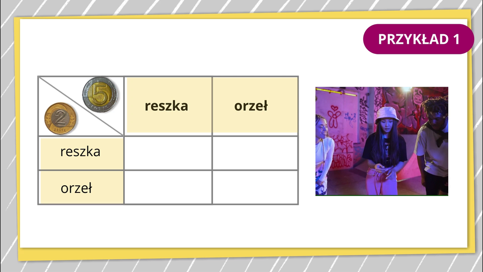 Na planszy pojawia się animacja. Ramka jest w kolorze szarożółtym w białe paski. W prawym górnym rogu znajduje się tekst. Przykład pierwszy. Napis jest na fioletowym tle. W centralnej części ekranu znajduje się tabelka. Ma trzy wiersze i trzy kolumny. Pierwszy wiersz pierwszej kolumny podzielony jest przekątną na dwie równe części. W pierwszej połowie znajduje się dwuzłotówka, natomiast w drugiej pięciozłotówka. W drugiej kolumnie pierwszego wiersza znajduje się tekst reszka. Jest pogrubiony. W trzeciej kolumnie pierwszego wiersza znajduje się tekst. Orzeł. Jest pogrubiony. W pierwszej kolumnie drugiego wiersza znajduje się tekst reszka. W pierwszej kolumnie trzeciego wiersza znajduje się tekst. Orzeł. W drugiej kolumnie drugiego wiersza jest zapis. Nawias otwarty, mała litera er, duża litera er, zamknięcie nawiasu. W trzeciej kolumnie drugiego wiersza jest zapis. Nawias otwarty, mała litera er, duża litera o, zamknięcie nawiasu. W drugiej kolumnie trzeciego wiersza jest zapis. Nawias otwarty, mała litera o, duża litera er, zamknięcie nawiasu. W trzeciej kolumnie trzeciego wiersza jest zapis. Nawias otwarty, mała litera o, duża litera o, zamknięcie nawiasu. Z prawej strony ekranu znajduje się okienko, w którym ukazane jest nagranie. Na nagraniu znajduje się pięć młodych osób, które rzucają jedną monetą i czekają na wynik.