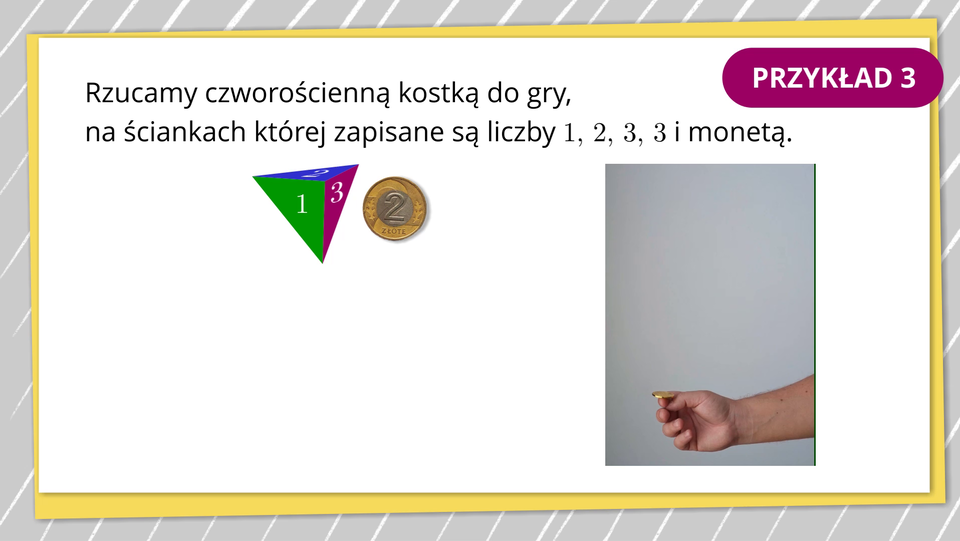 Na planszy pojawia się animacji. Na animacji jest białe tło. Ramka jest w kolorze szarożółtym w białe paski. W prawym górnym rogu znajduje się tekst. Przykład trzeci. Napis jest na fioletowym tle. Na slajdzie znajduje się napis. Rzucamy czworościenną kostką do gry, na ściankach której zapisane są liczby jeden, dwa, trzy, trzy, i monetą. Pod tekstem umieszczona jest grafika kolorowej kostki czworościennej, a obok dwuzłotowej monety odwróconej reszką. Po prawej stronie ekranu pokazane jest zbliżenie na rękę osoby, która podrzuca monetę. Demonstrator łapie monetę dłonią po podrzuceniu. Nagranie jest w spowolnionym tempie.
