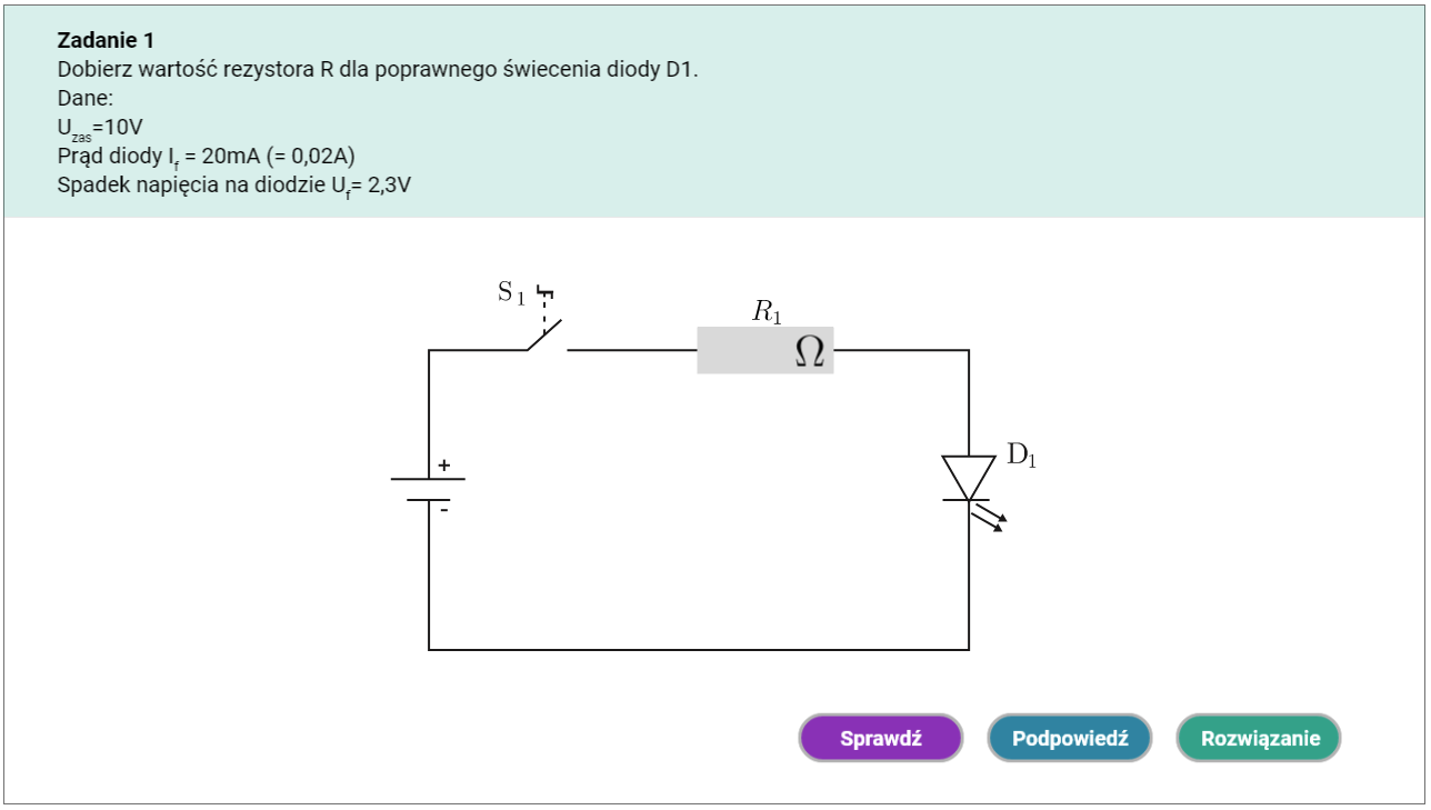 Program ćwiczeniowy do projektowania umożliwia zweryfikowanie wiedzy na temat prawa Ohma oraz praw Kirchhoffa.