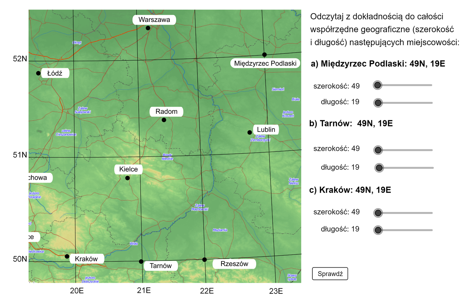 Odczytaj współrzędne geograficzne (szerokość i długość) podanych poniżej miejscowości.