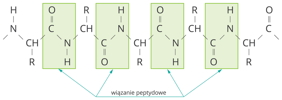 wiązanie peptydowe – powstaje w wyniku połączenia się aminokwasów; tworzą je grupy karboksylowa i aminowa łączących się cząsteczek aminokwasów