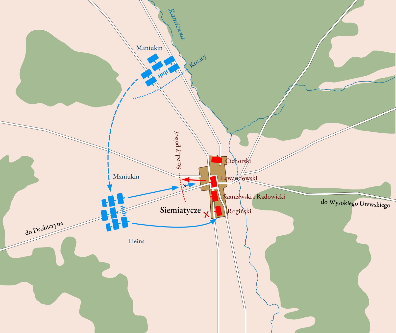 Mapa interaktywna pt. Bitwa pod Siemiatyczami, 6 - 7 lutego 1863 r. Na ilustracji przedstawiony został plan bitwy pod Siemiatyczami. Została ona stoczona 6 i 7 lutego 1863 r. Na mapie zaznaczone zostały Siemiatycze oraz okolice. Zaznaczone zostały drogi prowadzące do Drohiczyna oraz Wysokiego Litewskiego. Zaznaczone zostały kompleksy leśne wokół miasta oraz rzeka Kamienna, która przepływa w jego pobliżu. Na obszarze miasta zaznaczone zostały zgrupowania polskich oddziałów partyzanckich oraz wypisane zostały nazwiska ich dowódców: Rogińskiego, Szaniawskiego, Radowickiego, Lewandowskiego i Cichorskiego. Zaznaczone zostały pozycje wojsk rosyjskich pod dowództwem gen. Maniukina. Wojska rosyjskie obeszły miasto i zaatakowały je od zachodu. Mimo liczebnej przewagi oddziałów polskich Rosjanie odnieśli zwycięstwo w walce o miasto,. Oddziały rosyjskie zdobyły Siemiatycze, a powstańcy wycofali się z miasta. W trakcie walk miasto zostało spalone. Mapa składa się z warstwy bazowej i 7 warstw dodatkowych. Opis warstwy bazowej: Na mapie zaznaczone zostały Siemiatycze oraz okolice. Zaznaczone zostały drogi prowadzące do Drohiczyna oraz Wysokiego Litewskiego. Zaznaczone zostały kompleksy leśne wokół miasta oraz rzeka Kamienna, która przepływa w jego pobliżu. Na obszarze miasta zaznaczone zostały zgrupowania polskich oddziałów partyzanckich oraz wypisane zostały nazwiska ich dowódców: Rogińskiego, Szaniawskiego, Radowickiego, Lewandowskiego i Cichorskiego. Zaznaczone zostały pozycje wojsk rosyjskich pod dowództwem gen. Maniukina. Na warstwie bazowej znajduje się 1 punkt z dodatkowymi informacjami: ► Punkt 1 - Siemiatycze. Miasto powstałe w XV w. Od 1542 r. posiadało prawa miejskie (prawo magdeburskie). Znajdowało się na terenie województwa podlaskiego. Od samego początku było zamieszkiwane przez grupy ludności o różnych wyznaniach (w mieście znajdowały się cerkwie i kościoły). Miasto doznało dużych strat podczas Potopu w połowie XVII w. W czasie rozbiorów początkowo pod panowaniem pruskim, a od 1807 r. rosyjskim. Miasto znajdowało się na obszarze tzw. Ziem Zabranych, czyli włączonych bezpośrednio do Cesarstwa Rosyjskiego. Punkt z dodatkowymi informacjami zawiera również grafikę: W herbie Siemiatycz znajduje się dwudzielna tarcza herbowa. W jednym polu został przedstawiony herb szlachecki Prus III, którego używała rodzina Jabłonowskich, właścicieli Siemiatycz w XVIII wieku. W drugim herb szlachecki Lis, którym posługiwała się rodzina Sapiehów. Nad tarczą herbową znajduje się płaszcz oraz mitra książęca. Warstwy dodatkowe: ● Warstwa 1 - Stanowiska oddziałów powstańczych. Na mapie ukazane zostało uszykowanie wojsk powstańczych do walki na terenie Siemiatycz. Na warstwie 1 znajdują się 3 punkty z dodatkowymi informacjami: ► Punkt 1 - Roman Rogiński. Żył w latach 1840 - 1915; jeden z dowódców w powstaniu styczniowym; komisarz wojenny województwa podlaskiego, wydany Rosjanom przez chłopów, zesłany na Syberię; wrócił w 1890 r. Punkt z dodatkowymi informacjami zawiera również grafikę: Jest to postać stojąca z prawej. Jest to młody mężczyzna, z okrągłej twarzy, z włosami zaczesanymi do tyłu. Ubrany jest w mundur. Stoi opierając się na trzymanej w lewym ręku szabli. ► Punkt 2 - Walenty Lewandowski. Żył w latach 1823 - 1907; brał udział w Wiośnie Ludów na Węgrzech; w powstaniu styczniowym naczelnik wojenny województwa podlaskiego; zesłany na Syberię; wrócił w 1877 r. Punkt z dodatkowymi informacjami zawiera również grafikę: Ilustracja przedstawia scenę z czasów powstania styczniowego. Z lasu wychodzi oddział powstańców. Młody mężczyzna w czapce konfederatce kroczy na czele oddziału, niosąc sztandar. Za nim podąża grupa powstańców, uzbrojona w broń palną. Jeden z powstańców leży pod drzewem a drugi pochyla się nad nim udzielając mu pomocy. ► Punkt 3 - Władysław Cichorski. Żył w latach 1822‑1876; pułkownik wojsk powstańczych, jeden z dowódców oddziałów na Podlasiu; przebywał na emigracji we Francji, po powrocie osiadł w Galicji. Punkt z dodatkowymi informacjami zawiera również grafikę: Ilustracja przedstawia portret mężczyzny w starszym wieku, ma on łysą głowę oraz długą rozłożystą brodę. ● Warstwa 2 - Stanowiska wojsk rosyjskich. Oddziały rosyjskie zajmowały pozycje na północ od miasta. Składały się z oddziałów piechoty, formacji Kozaków oraz artylerii. Na warstwie 2 znajduje się 1 punkt z dodatkowymi informacjami: ► Punkt 1 - Zachar Maniukin. Żył w latach 1799 - 1882, generał wojsk rosyjskich, podczas powstania dowódca 2 Dywizji, został nazwany „katem Podlasia”. Punkt z dodatkowymi informacjami zawiera również grafikę: Ilustracja przedstawia sztandar armii rosyjskiej w czasach cesarstwa rosyjskiego w XIX wieku. Na sztandarze przedstawiony został rosyjski orzeł cesarski. Jest to dwugłowy ptak w kolorze czarnym. Na jego piersi umieszczone zostały herby różnych ziem, które wchodziły w skład państwa rosyjskiego. ● Warstwa 3 - Manewr wojsk rosyjskich. Oddziały rosyjskie obeszły od wschodu Siemiatycze i zajęły dogodniejsze dla siebie pozycje do ataku ● Warstwa 4 - Atak wojsk rosyjskich. Oddziały rosyjskie zaatakowały Siematycze od strony zachodniej, jednocześnie oskrzydlając miasto i atakując je od południa. Po przełamaniu pozycji zajmowanych przez polskich strzelców wojska rosyjskie próbowały wedrzeć się do miasta. ● Warstwa 5 - Przełamanie pozycji polskich. Wojska rosyjskie przełamały pozycje oddziałów polskich. ● Warstwa 6 - Kontratak kosynierów. Aby uratować sytuację do ataku ruszyli kosynierzy. Jednak atak nie powiódł się, a formacja kosynierów poszła w rozsypkę. ● Warstwa 7 - Zdobycie miasta przez wojska rosyjskie. W wyniku walk w samych Siemiatyczach miasto zostało zdobyte i spalone przez Rosjan. Oddziały polskie wycofały się z