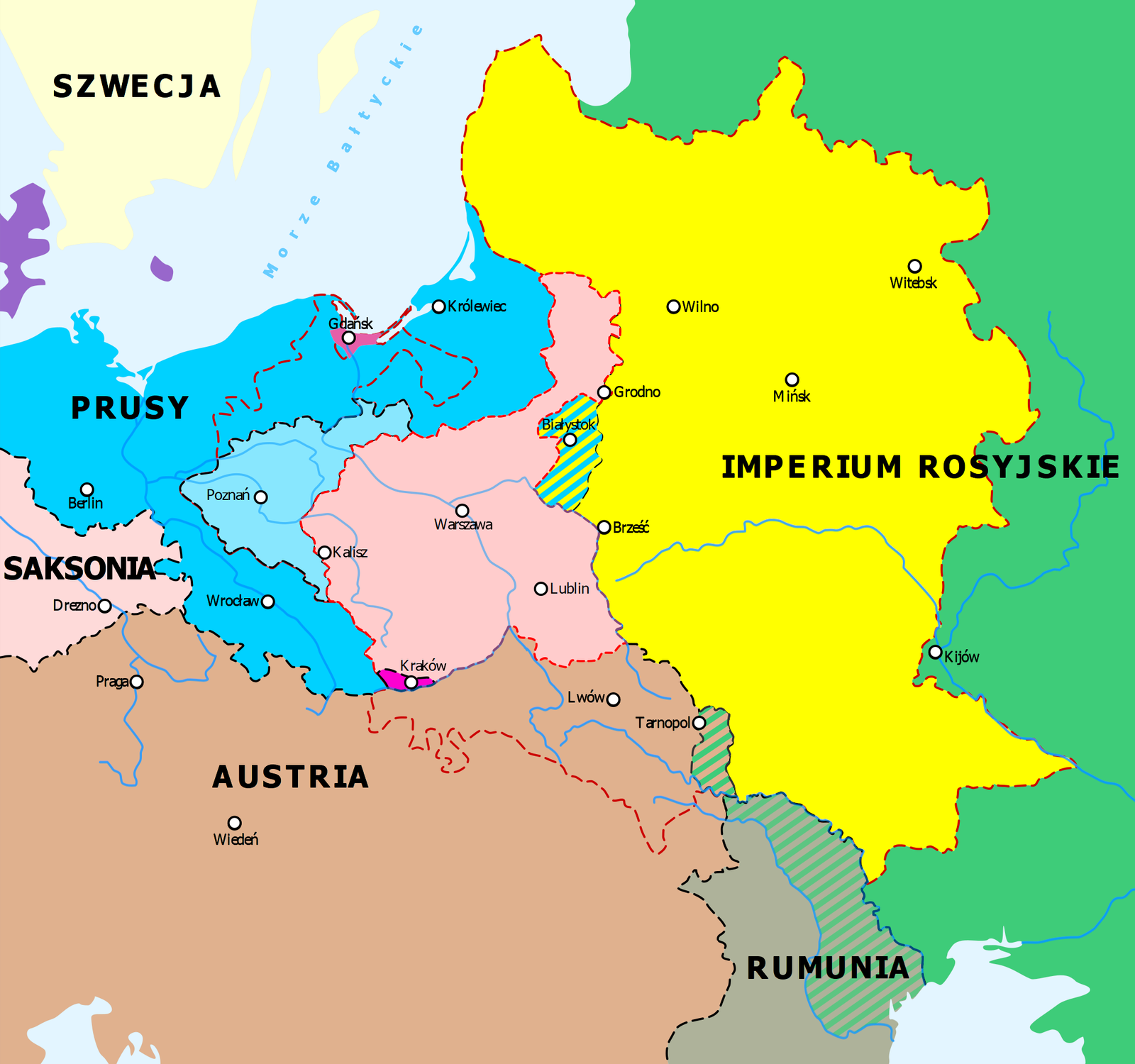 Mapa interaktywna pt. Dawne ziemie Rzeczypospolitej w XIX wieku Mapa przedstawia podział ziem dawnej Rzeczypospolitej, które zostały podzielone między mocarstwa rozbiorowe - Rosję, Prusy i Austrię. Celem mapy jest ukazanie zmian w podziałach ziem polskich w epoce napoleońskiej oraz po Kongresie Wiedeńskim. Na mapie zaznaczono ziemie należące do Rosji - Królestwo Polskie oraz tzw. Ziemie Zabrane; do Prus - Wielkie Księstwo Poznańskie oraz Pomorze Gdańskie; do Prus - Galicję. Na mapie zaznaczono najważniejsze miasta znajdujące się na obszarze dawnej Rzeczypospolitej - Wilno, Mińsk, Witebsk, Grodno, Białystok, Brześć, Poznań, Warszawa, Kalisz, Lublin, Kraków. Zaznaczone zostały granice innych państw. Uwzględniono również obszary, które zmieniły swoją przynależność - obwód białostocki, który w 1809 r. został przejściowo przyłączony do Rosji (do 1815 r.) oraz obwód białostocki w 1807 r. przyłączony do Rosji i pozostający w jej granicach do wybuchu I wojny światowej. Mapa składa się z warstwy bazowej i 2 warstw dodatkowych. Opis warstwy bazowej: Mapa przedstawia przebieg granic państwowych Rzeczypospolitej Obojga Narodów według stanu sprzed I rozbioru (z roku 1772). Zaznaczone zostały granice innych państw - Prus, Saksonii, Austrii, Rosji, Rumunii. Ponadto zaznaczono przebieg najważniejszych rzek - Dniepru, Prutu, Łaby, Wisły, Odry, Warty. Warstwy dodatkowe: ● Warstwa 1 - Zmiany w epoce napoleońskiej. W czasach napoleońskich na ziemiach polskich zostało utworzone Księstwo Warszawskie. Obejmowało ono część dawnego zaboru pruskiego i austriackiego. Jego powstanie było wynikiem układów zawartych w Tylży. Ponadto do Rosji przyłączony został obwód białostocki (ziemie odebrane Prusom) oraz kraj tarnopolski (ziemie odebrane Austrii). Utworzone zostało również Wolne Miasto Gdańsk. Na warstwie 1 znajdują się 3 punkty z dodatkowymi informacjami: ► Punkt 1 - Wolne Miasto Gdańsk. Autonomiczny twór polityczny istniejący w latach 1807‑1814. Utworzony na mocy pokoju w Tylży, pozostający pod faktycznym panowaniem francuskim. Zlikwidowany na kongresie wiedeńskim i włączone do Prus. Punkt z dodatkowymi informacjami zawiera również grafikę: Na czerwonym tle flagi umieszczone zostały pionowo z prawej strony dwa krzyże a nad nimi korona królewska. ► Punkt 2 - Księstwo Warszawskie. Państwo utworzone w 1807 r. na mocy pokoju w Tylży. Istniało formalnie do 1815 r. Pozostawało w unii personalnej z Saksonią, której władca był księciem warszawskim. Punkt z dodatkowymi informacjami zawiera również grafikę: Ilustracja przedstawia herb Księstwa Warszawskiego. Tarcza herbowa podzielona została pionowo na dwie części. Na lewej znajduje się herb dynastii Wettinów (umieszczona przepaska zwieńczona liliami) na żółtym tle w poziome czarne pasy). Na prawej umieszczono polskiego orła w koronie trzymającego w pazurach insygnia królewskie - jabłko i berło. ► Punkt 3 - Ziemie Zabrane. Obszar ziem Rzeczypospolitej, które w wyniku rozbiorów zostały wcielone do Cesarstwa Rosyjskiego. Nie weszły one w skład Królestwa Polskiego utworzonego na kongresie wiedeńskim. Stanowiły ponad połowę terytorium przedrozbiorowej Rzeczypospolitej. ● Warstwa 2 - Zmiany wprowadzone na kongresie wiedeńskim w 1815 r. W 1815 r. zostały wprowadzone zmiany w podziale ziem polskich. Księstwo Warszawskie zostało podzielone. Większa jego część została przekształcona w Królestwo Polskie i połączona z Rosją. Mniejsza część pod nazwą Wielkie Księstwo Poznańskie połączona została z Prusami. Zlikwidowano Wolne Miasto Gdańsk i włączono je do Prus. Utworzono oddzielne państwo pod nazwą Rzeczpospolita Krakowska, które pozostawało formalnie niezależne pod zwierzchnictwem trzech mocarstw zaborczych. W 1846 r. została ona zlikwidowana i przyłączona do Galicji (czyli do Austrii). Na warstwie 2 znajdują się 3 punkty z dodatkowymi informacjami: ► Punkt 1 - Rzeczpospolita Krakowska (Wolne Miasto Kraków). Oddzielne państwo utworzone na kongresie wiedeńskim, formalnie niepodległe, w rzeczywistości pozostające pod kontrolą mocarstw rozbiorowych; po powstaniu krakowskim w 1846 włączone do Austrii. Punkt z dodatkowymi informacjami zawiera również grafikę: Ilustracja przedstawia okrągłą pieczęć, na której umieszczony został herb Wolnego Miasta Krakowa. W herbie znajduje się widok bramy miejskiej zwieńczonej trzema wieżami. W otwartej bramie umieszczony został polski orzeł, nad którego głową umieszczona została korona. ► Punkt 2 - Królestwo Polskie. Królestwo Polskie utworzone zostało w 1815 r. na kongresie wiedeńskim. Pierwszym jego królem był car rosyjski Aleksander I. Po powstaniu listopadowym (1830‑1831) autonomia Królestwa została znacznie ograniczona, a po powstaniu styczniowym Królestwo zostało faktycznie wcielone do Rosji. Punkt z dodatkowymi informacjami zawiera również grafikę: Portret przedstawia łysiejącego mężczyznę w średnim wieku. Ubrany jest w mundur wojskowy z epoletami. Ma przewieszoną przez pierś szarfę orderową, a powyżej szarfy rząd medali wojskowych. ► Punkt 3 - Wielkie Księstwo Poznańskie. Terytorium autonomiczne w granicach Królestwa Prus. Obejmowało większą część Wielkopolski i Kujawy. Utworzone na kongresie wiedeńskim. Jego pierwszym namiestnikiem z ramienia króla pruskiego został ks. Antoni Radziwiłł. Księstwo formalnie istniało aż do 1918 r., a królowie pruscy używali tytułu książąt poznańskich. Punkt z dodatkowymi informacjami zawiera również grafikę: Ilustracja przedstawia widok Poznania. Widok przedstawia zabudowania miejskie, w tym pałac Górków, kolegium jezuickie oraz kościół Bernardynów. Po ulicach przechadzają się przechodnie, widać również kilku jeźdźców podróżujących konno.