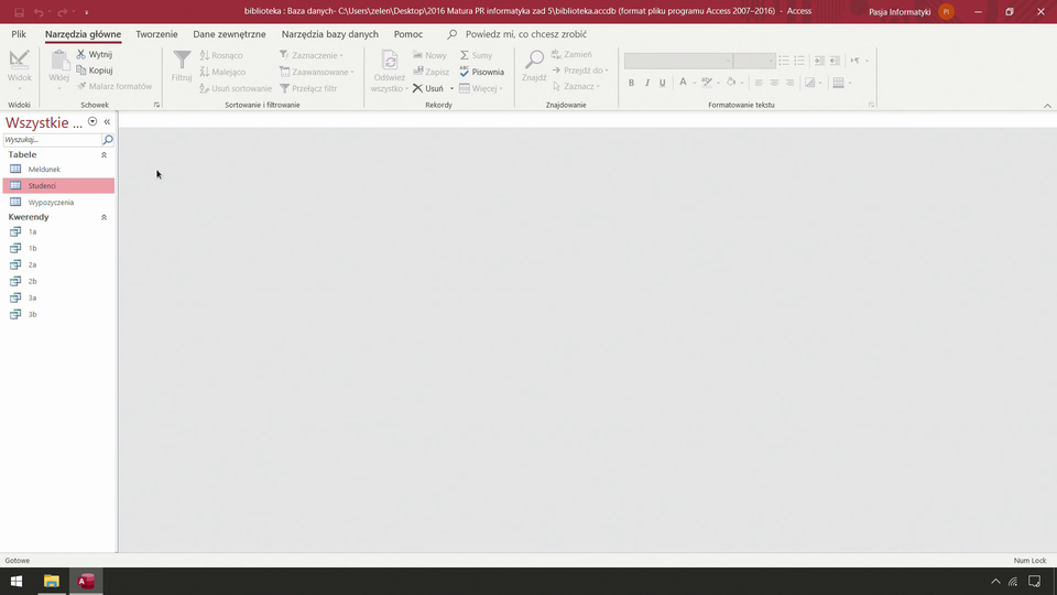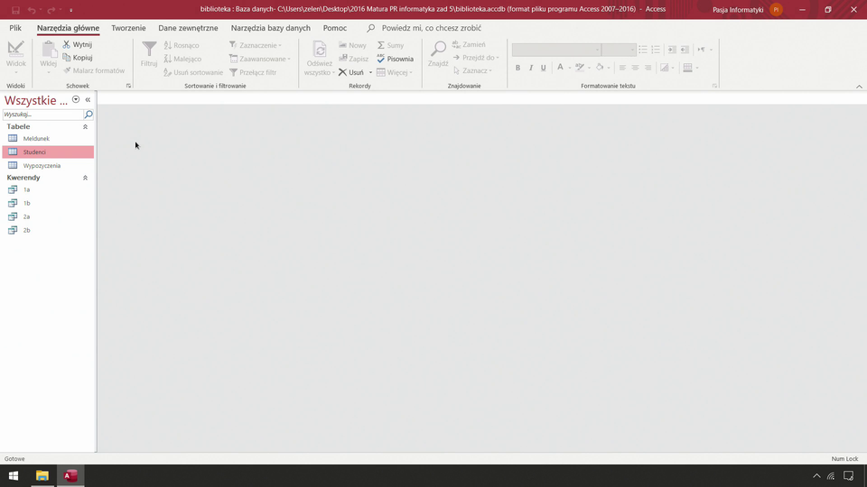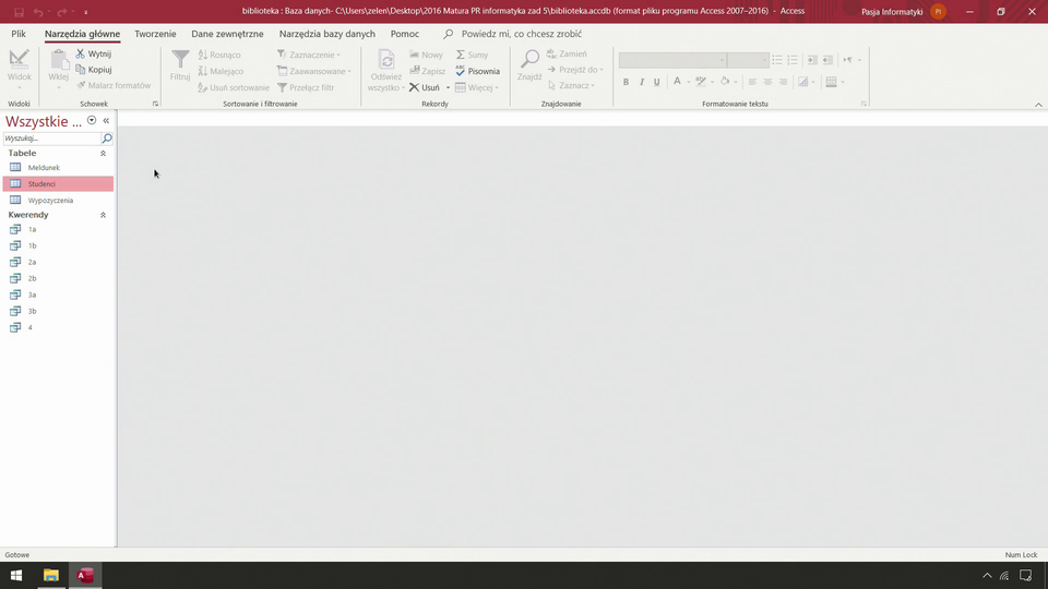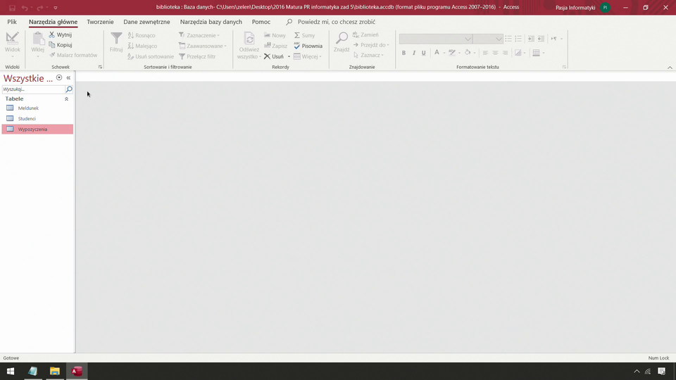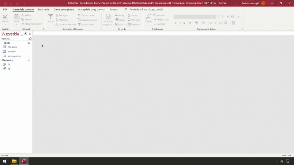 Przedstawimy rozwiązanie wszystkich części zadania. Zanim przystąpimy do pracy, przygotujemy w programie Microsoft Access nowy plik bazy danych, noszący np. nazwę biblioteka.accdb.