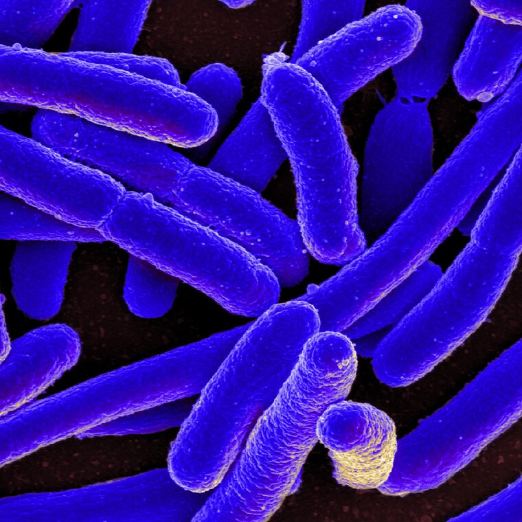 22. Instrukcja: Obejrzyj preparat z Escherichia coli pod mikroskopem. Ukazane jest zdjęcie w powiększeniu mikroskopowym. Są tu liczne, pałeczkowate bakterie wybarwione na kolor różowy.