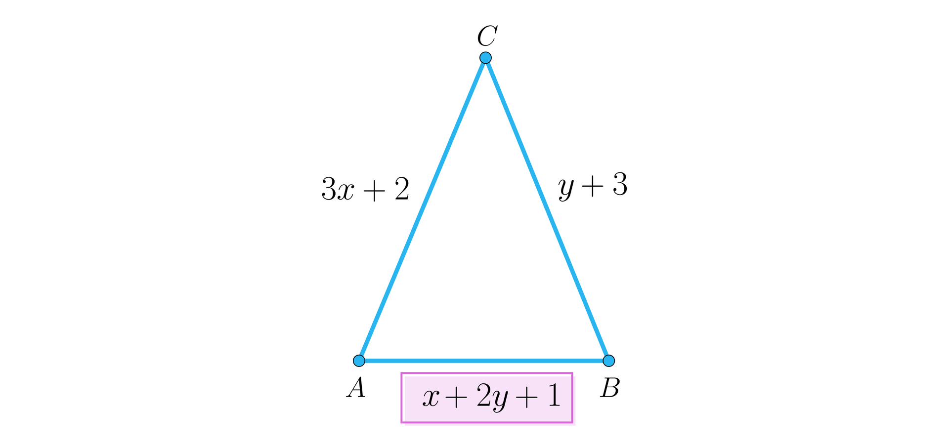 Obliczymy długości boków trójkąta równoramiennego przedstawionego na poniższym rysunku, wiedząc, że podstawa jest o dłuższa od jednego z ramion.
