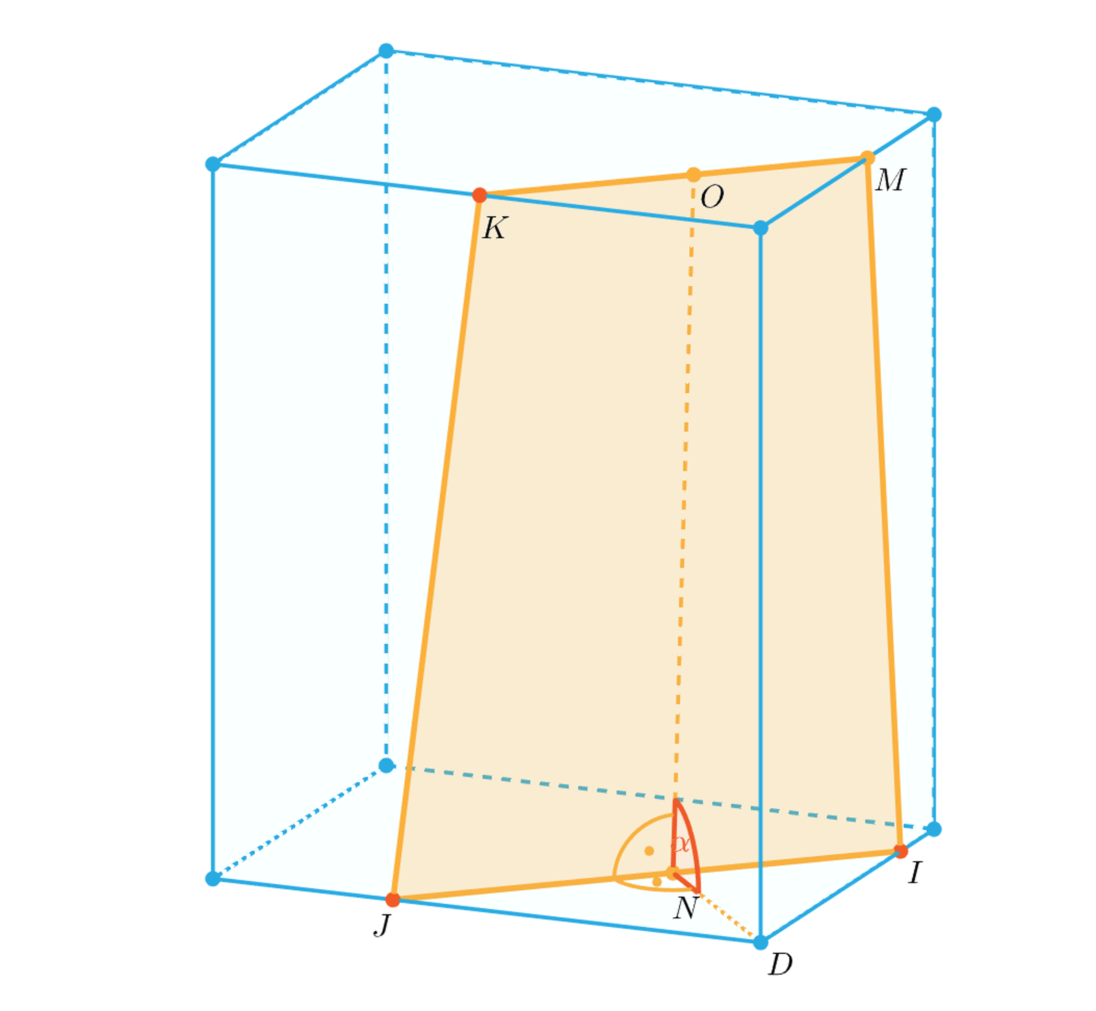 Na ilustracji przedstawiono prostopadłościan o dolnej podstawie , oraz górnej . Odpowiednio nad wierzchołkiem A znajduje się wierzchołek E, nad wierzchołkiem B wierzchołek F i tak dalej. Zaznaczono punkt M na krawędzi górnej podstawy, oraz punkt K na krawędzi górnej podstawy. Punkty M i K, połączono z wierzchołkami A, C dolnej podstawy, w taki sposób, że powstał przekrój prostopadłościanu, którego płaszczyznę stanowi trapez. Linią przerywaną poprowadzono wysokość trapezu z punktu O, na podstawie , której spodek leży w punkcie N, na dolnej podstawie trapezu. Odcinek stanowi wysokość trójkąta . Zaznaczono , który jest kątem nachylenia płaszczyzny przekroju do płaszczyzny podstawy i oznaczono go alfa.