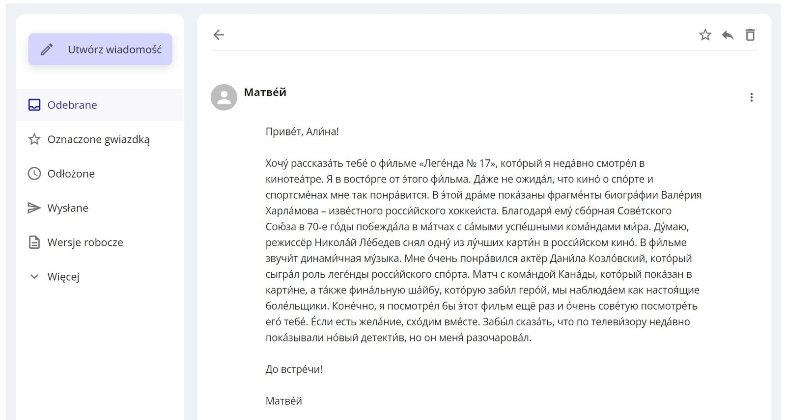 Хочу́ рассказа́ть тебе́ о фи́льме «Леге́нда № 17», кото́рый я неда́вно смотре́л в кинотеа́трекинотеа́тркинотеа́тре. Я в восто́рге от э́того фи́льмав восто́рге от фи́льмав восто́рге от э́того фи́льма. Да́же не ожида́ложида́ть ожида́л, что кино́кино́кино́ о спо́рте и спортсме́нах мне так понра́вится. В э́той дра́ме пока́заны фрагме́нты биогра́фиибиогра́фия биогра́фии Вале́рия Харла́мова – изве́стного росси́йского хоккеи́ста. Благодаря́ ему́ сбо́рнаясбо́рная сбо́рнаяСове́тского Сою́заСове́тский Сою́з Сове́тского Сою́за в 70‑е го́ды побежда́лапобежда́ть побежда́ла в ма́тчах с са́мыми успе́шнымиса́мый успе́шныйса́мыми успе́шнымикома́ндамикома́ндакома́ндами ми́ра. Ду́маю, режиссёр Никола́й Ле́бедев снялснятьснял одну́ из лу́чших карти́нкарти́на карти́н в росси́йском кино́. В фи́льме звучи́тзвуча́тьзвучи́т динами́чная му́зыка. Мне о́чень понра́вился актёр Дани́ла Козло́вский, кото́рый сыгра́лсыгра́тьсыгра́лрольроль роль леге́нды росси́йского спо́рта. Матч с кома́ндойкома́ндакома́ндой Кана́ды, кото́рый пока́зан в карти́не, а та́кже фина́льную ша́йбуша́йбaша́йбу, кото́рую заби́л геро́йгеро́йгеро́й, мы наблюда́ем как настоя́щие боле́льщикиболе́льщикболе́льщики. Коне́чно, я посмотре́л бы э́тот фильм ещё раз и о́чень сове́туюсове́товатьсове́тую посмотре́ть его́ тебе́. Е́сли есть жела́ниежела́ниежела́ние, схо́дим вме́сте. Забы́л сказа́ть, что по телеви́зору неда́вно пока́зывали но́вый детекти́в, но он меня́ разочарова́лразочарова́ть разочарова́л.