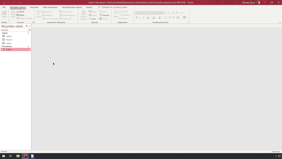 Przed przystąpieniem do pracy nad zadaniem, pobierz plik Lekarze.accdb lub Lekarze.odb, zależnie od wybranego systemu DBMSDBMS – odpowiednio MS Access lub LibreOffice Base. Obydwa pliki można pobrać poniżej: