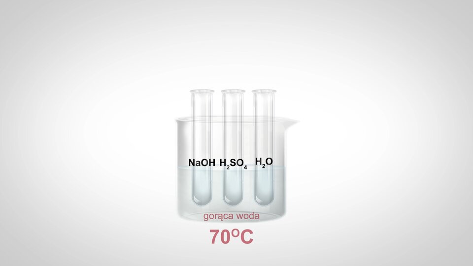 Film prezentuje doświadczenie. Są trzy probówki: w jednej jest pięcioprocentowy roztwór wodorotlenku sodu en a o ha, w drugiej pięcioprocentowy roztwór kwasu siarkowego sześć ha dwa es o cztery, w trzeciej woda destylowana ha dwa o. Do każdej probówki dodano ce 4 ha 8 o 2. Trzy probówki włożono do gorącej wody - ma 70 stopni. Zapach octowy wydzielił się w probówce drugiej. W pozostałych brak zapachu.