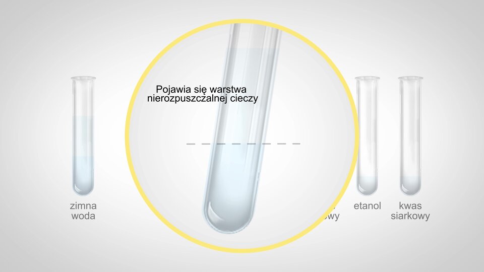 Film prezentujący doświadczenie. Do doświadczenia potrzeba pięciu probówek. Po lewej stronie jest probówka z zimną wodą oraz pusta probówka. Po prawej stronie są trzy probówki, w których kolejno znajdują się: kwas octowy, etanol i kwas siarkowy. Do pustej probówki wlewamy kwas octowy, etanol i kwas siarkowy. Zanurzamy probówkę w gorącej wodzie. Następnie zawartość probówki przelewamy do probówki z zimną wodą. Pojawia się warstwa nierozpuszczalnej cieczy.