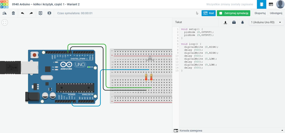 Zrzut ekranu przedstawia okno przeglądarki z otwartą stroną tinkercad. Pod adresem strony znajduje się pasek tytułowy "0940 Arduino – kółko i krzyżyk, część 1". Poniżej znajduje się pasek z opcjami. Po lewej paska znajdują się między innymi ikonka kosza, strzałki cofania i do przodu, po prawej stronie paska znajdują się następujące przyciski: Kod, Uruchom symulację, Eksportuj, Udostępnij, a pod nimi znajduje się wybrana opcja „Podstawowe” z listy „Komponenty”. Poniżej znajduje się pole, w którym umieszczono płytkę stykową. W płytkę wpięto obok siebie dwie diody połączone wspólną katodą. Od lewej: czerwoną i niebieską. Prawe nóżki diod połączone są z rezystorami wpiętymi w środek płytki stykowej. W polu po prawej stronie od płytki stykowej znajduje się moduł Arduino, a po prawej stronie modułu znajduje się kabel USB. Diody podpięte są do pinu GND modułu Arduino. W wierszu, w którym znajduje się pierwszy rezystor (czyli ten po lewej stronie), wpięto przewód i podłączono go do pinu D8 w module Arduino. W wierszu, w którym znajduje się drugi rezystor (czyli ten po prawej stronie), wpięto przewód i podłączono go do pinu D9 w module Arduino. Po prawo znajduje się pole z kodem zatytułowane Tekst. Kod jest następujący: 1. void setup() { 2. pinMode (8, OUTPUT); 3. pinMode (9, OUTPUT); 4. } 5. 6. void loop() { 7. digitalWrite (8, HIGH); 8. delay (500); 9. digitalWrite (9, HIGH); 10. delay (500); 11. digitalWrite (8, LOW); 12. delay (500); 13. digitalWrite (9, LOW); 14. delay (500); 15. }