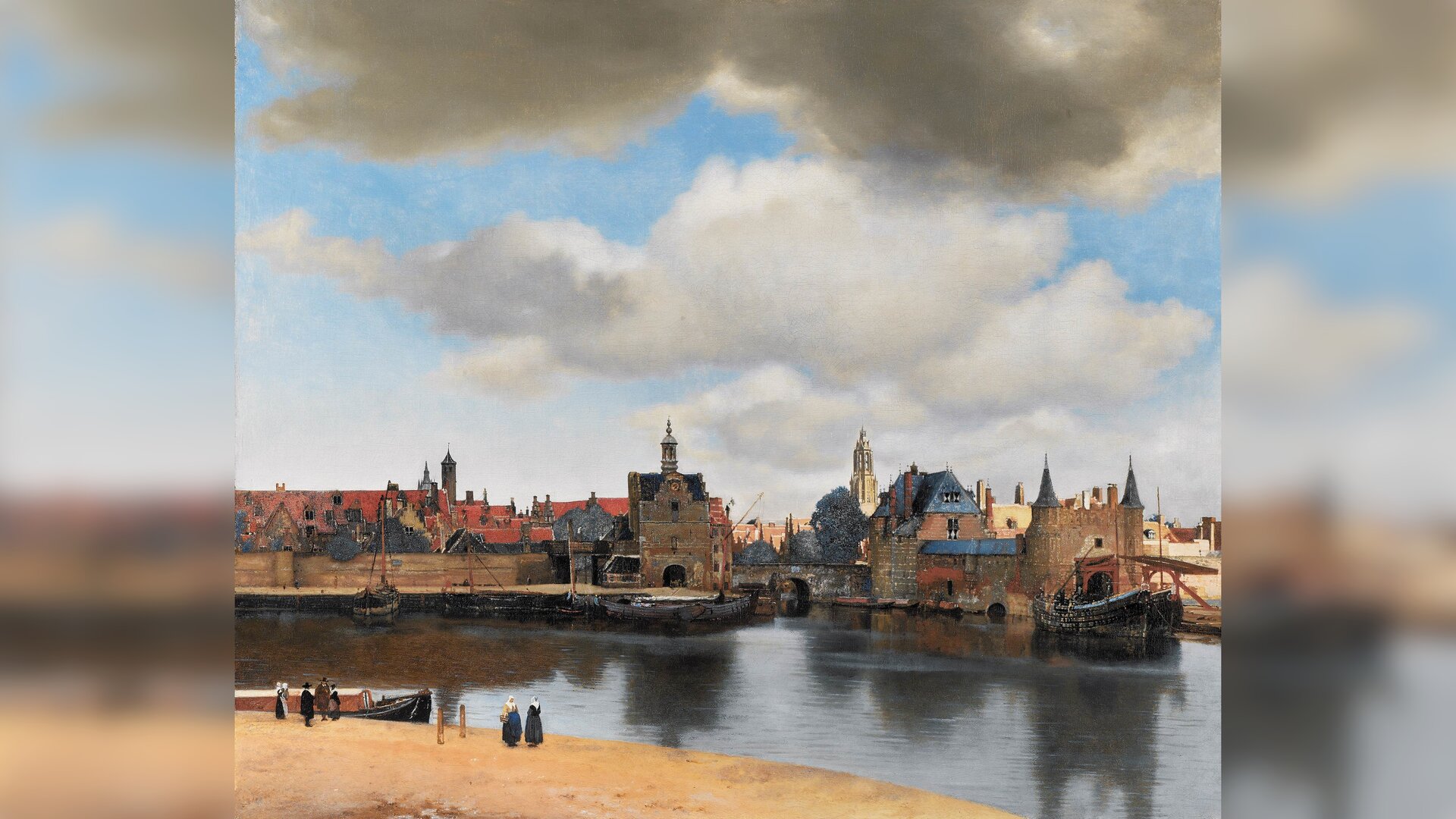Johannes Vermeer, Widok Delft, 1660- 1661, źródło: domena publiczna. Obraz przedstawia pejzaż miejski. Kompozycja składa się czterech pasów: piaszczystego brzegu, wody, zabudowań miejskich i najszerszego pasa nieba. Płótno ukazuje fragment miasta Delft i nabrzeże rzeki Schie. Na piaszczystym brzegu znajdują się dwie zajęte rozmową kobiety. Obok stoi kilka osób (matka z dzieckiem, dwóch mężczyzn i kobieta), być może przygotowujących się do wypłynięcia łodzią. Na rzece znajdują się łodzie i barki. W mieście znajdują się liczne domy, bramy, wieże. Budynki znajdujące się bliżej, pogrążone są w cieniu, podczas gdy te z tyłu są oświetlone przez słońce, przedzierające się przez gęste chmury. Szczególnie jasna jest wieża kościoła.