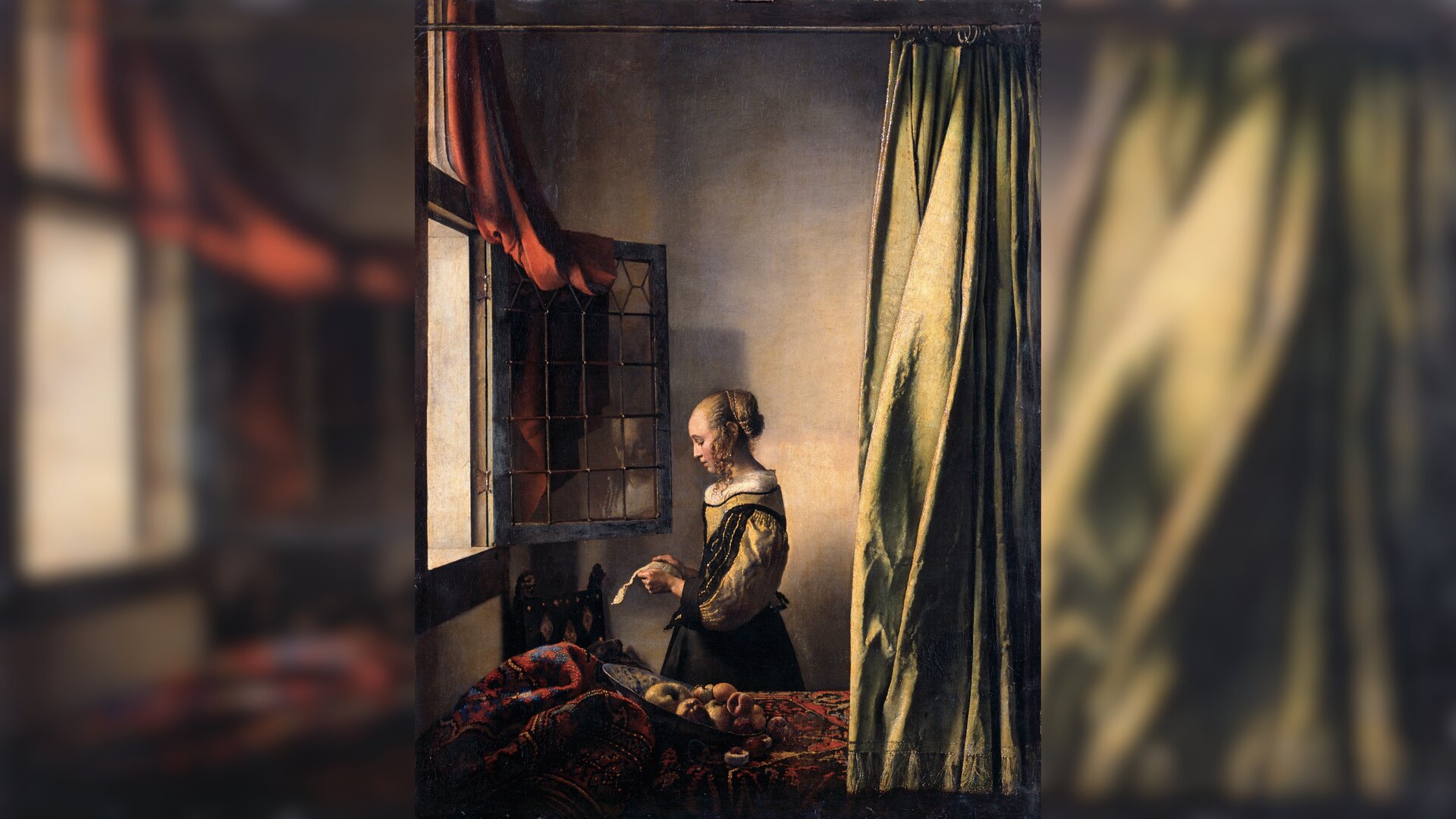 Johannes Vermeer, Dziewczyna czytająca list, ok. 1658, źródło: domena publiczna. Obraz przedstawia portret młodej dziewczyny. Znajduje się ona w pomieszczeniu z otwartym oknem. Dziewczyna stoi i czyta list. Jest ukazana przedstawiona lewym profilem, ale jej twarz odbija się w szybkach okiennych. Dziewczyna ma elegancką, bogato zdobioną suknię z bufiastymi rękawami. Włosy dziewczyny są starannie uczesane w kok, a po bokach głowy zwisają kręcone kosmyki jej jasnych włosów. Na pierwszym planie znajduje się stół, na którym jest rozłożony i udrapowany bogato zdobiony obrus, wyglądem przypominający dywan. Na nim spoczywa misa z owocami: brzoskwiniami i jabłkami. Z prawej strony zwisa zielona kotara, rozwieszona na drążku, biegnącym wzdłuż górnej krawędzi płótna. Inna zasłona, koloru czerwonego, zawieszona jest przy oknie.