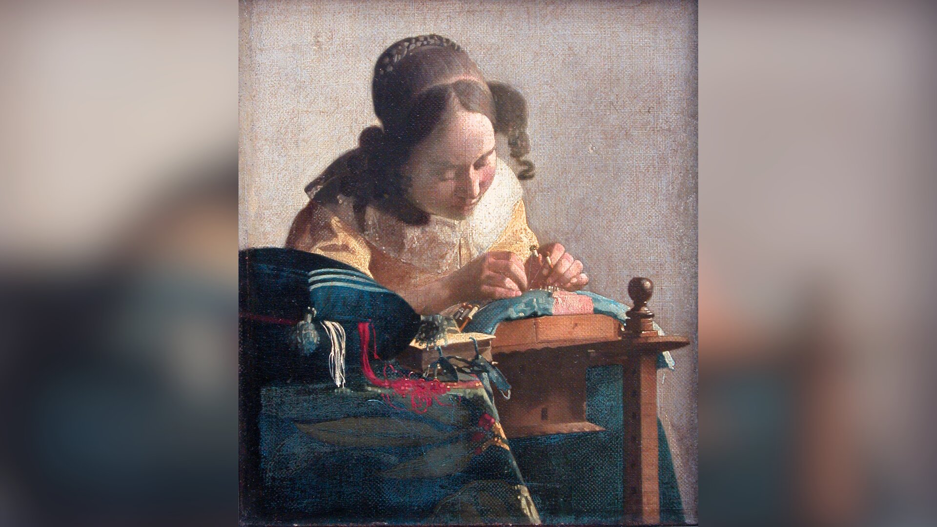 Johannes Vermeer, Koronczarka, ok. 1664, źródło: Philippe Lelong, Wikimedia Commons, licencja: CC BY‑SA 4.0. Obraz przedstawia modą kobietę pochyloną nad warsztatem koronczarskim. Młoda dziewczyna jest skoncentrowana na swojej pracy, wzrok ma spuszczony i skupiony na miniaturowym warsztacie pracy. To specjalny, drewniany stół przystosowany do robienia koronek. Dziewczyna ma ułożone starannie włosy, a nad uszami pukle kręconych włosów. Ubrana jest w żółtą suknię z dużym, białym kołnierzem. Obok niej, po prawej jej stronie, na małym stoliku przykrytym kolorowym dywanem znajduje się książka oraz duża, niebieska poduszka krawiecka. Z otwartej poduszki wystają białe i czerwone nici o niezwykle płynnej, niemal abstrakcyjnej formie.