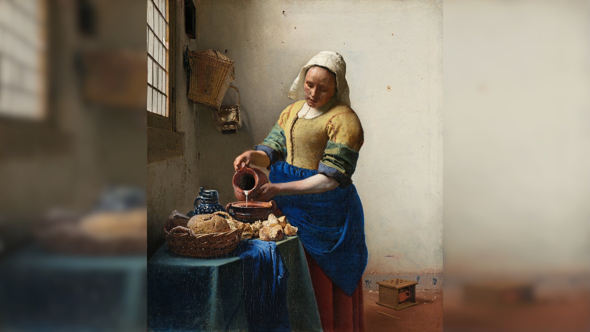 Johannes Vermeer, Mleczarka, ok. 1660, źródło: domena publiczna. Obraz przedstawia służącą, znajdującą się w pomieszczeniu, w pobliżu okna. Dziewczyna, znajduje się w centralnej części płótna i skupiona jest na przelewaniu mleka z dzbana do garnka stojącego na stole. Służąca ma na sobie żółto‑niebieską suknię i biały czepiec na głowie. Wzrok ma spuszczony. Na stole przykrytym zielonym obrusem, za którym stoi, znajduje się koszyk z chlebem i innym pieczywem, dzban i niebieska tkanina. Chleb namalowany jest techniką pointillé – przy pomocy drobnych plamek, które ukazują grę światła na tym przedmiocie. W tle, na ścianie zawieszony jest kosz i metalowe naczynie, a na podłodze po jej lewej stronie stoi ogrzewacz do stóp.